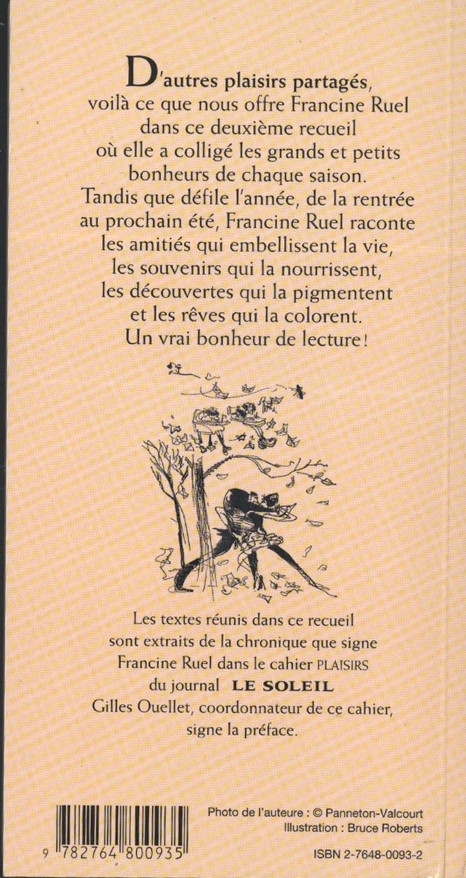 Pour une deuxième fois, la comédienne Francine Ruel nous emmène avec elle... quand l’automne lui donne envie de redevenir étudiante, quand Québec lui ouvre les bras, quand elle se fracture une cheville ou quand le Saint-Laurent lui rappelle Venise aux jours du carnaval... D'autres plaisirs partagés rassemble plus de 30 chroniques de Francine Ruel publiées dans le quotidien Le Soleil entre l’automne 2002 et le printemps 2003. L’artiste Bruce Roberts a accepté d’illustrer de son trait sans pareil les confidences de cette incorrigible épicurienne. À déguster à petites doses, tout au long de l’année !