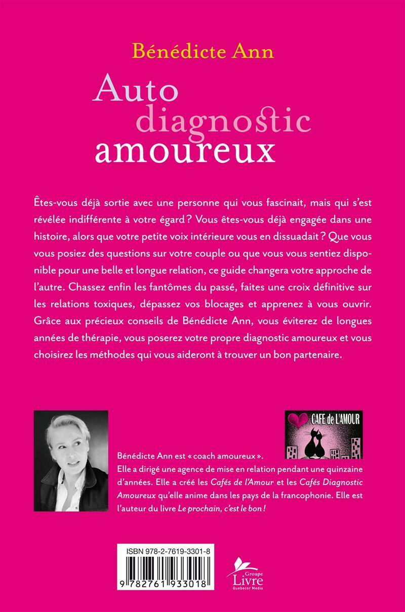 Êtes-vous déjà sortie avec un homme qui vous fascinait mais qui s'est révélé indifférent à votre égard? Vous êtes-vous déjà engagée dans une histoire,alors que votre petite voix intérieure vous en dissuadait? Que vous vous posiez des questions sur votre couple ou que vous vous sentiez disponible pour une belle et longue relation, ce guide changera votre approche de l'autre. Chassez enfin les fantômes du passé, faites une croix définitive sur les relations toxiques, dépassez vos blocages et apprenez à vous ouvrir.Grâce aux précieux conseils de Bénédicte Ann, vous éviterez de longues années de thérapie, vous poserez votre propre diagnostic amoureux et vous choisirez les méthodes qui vous aideront à atteindre votre objectif.