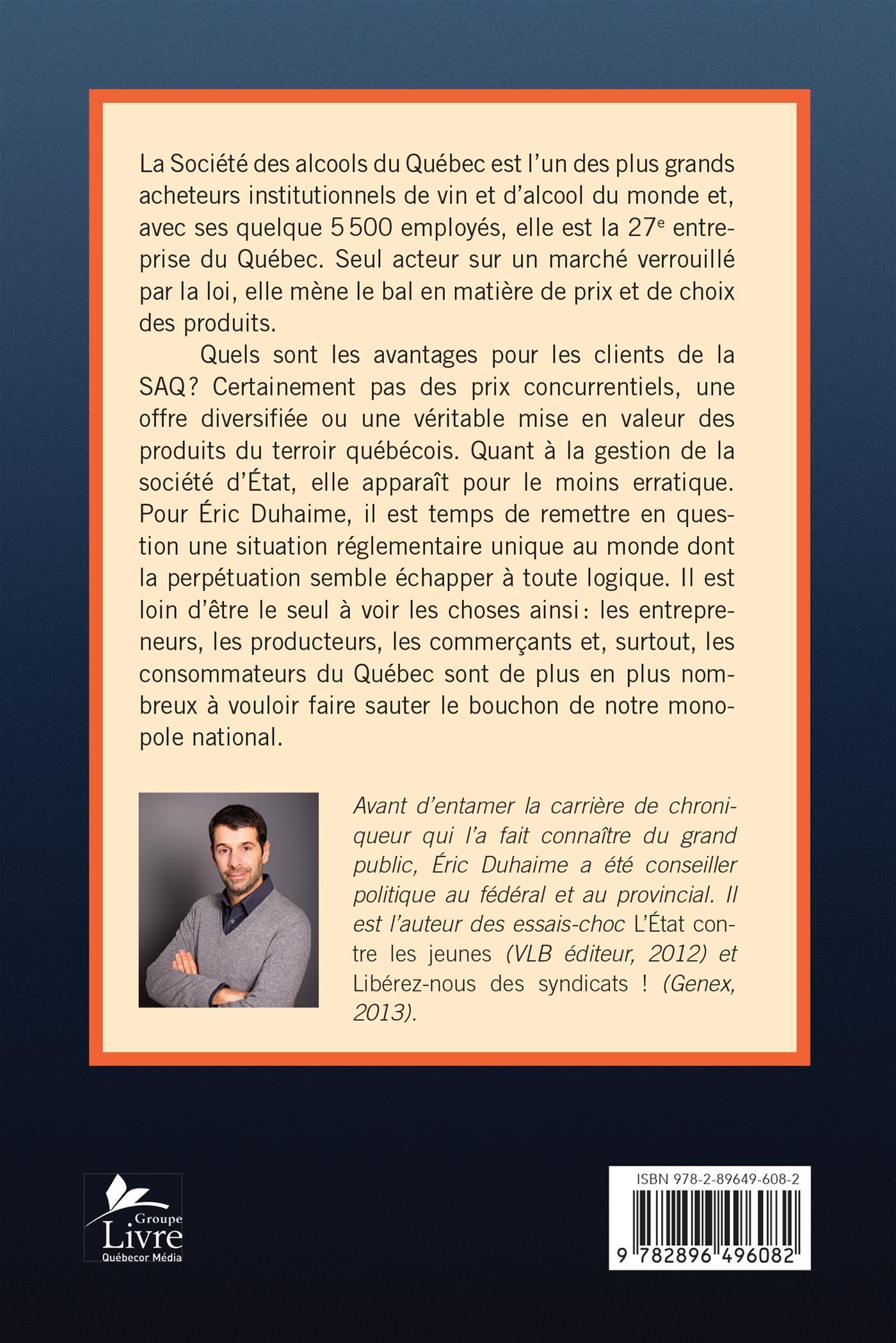 La Société des alcools du Québec est l'un des plus grands acheteurs institutionnels de vin et d'alcool du monde et, avec ses quelque 5 500 employés, elle est la 27e entreprise du Québec. Seul acteur sur un marché verrouillé par la loi, elle mène le bal en matière de prix et de choix des produits. .. ..Quels sont les avantages pour les clients de la SAQ ? Certainement pas des prix concurrentiels, une offre diversifiée ou une véritable mise en valeur des produits du terroir québécois. Quant à la gestion de la société d'État, elle apparaît pour le moins erratique. Pour Éric Duhaime, il est temps de remettre en question une situation réglementaire unique au monde dont la perpétuation semble échapper à toute logique. Il est loin d'être le seul à voir les choses ainsi : les entrepreneurs, les producteurs, les commerçants et, surtout, les consommateurs du Québec sont de plus en plus nombreux à vouloir faire sauter le bouchon de notre monopole national.