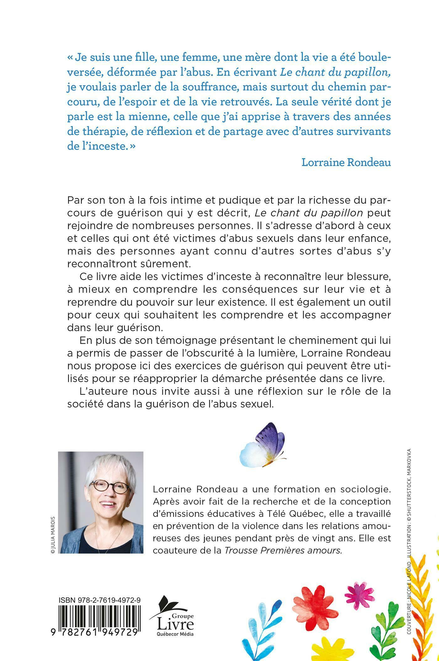 Par son ton à la fois intime et pudique et par la richesse du parcours de guérison qui y est décrit, Le chant du papillon peut rejoindre de nombreuses personnes. Il s'adresse d'abord à ceux et celles qui ont été victimes d'abus sexuels dans leur enfance, mais des personnes ayant connu d'autres sortes d'abus s'y reconnaîtront sûrement.