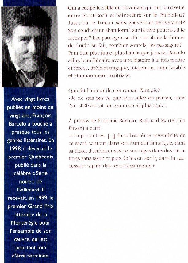 Qui a coupé le câble du traversier qui fait la navette entre Saint-Roch et Saint-Ours sur le Richelieu? Jusqu’où le bateau sans gouvernail dérivera-t-il? Son conducteur abandonné sur la rive pourra- t-il le rattraper? Les passagers souffriront-ils de la faim et du froid? Au fait, combien sont-ils, les passagers? Peut-être plus fou et plus habile que jamais, Barcelo salue le millénaire avec une histoire à la fois tendre et féroce, drôle et tragique, totalement imprévisible et étonnamment maîtrisée. Que dit l’auteur de son roman Tant pis? «Je ne sais pas ce que vous allez en penser, mais l’an 2000 aurait pu commencer plus mal.» À propos de François Barcelo, Réginald Martel (La Presse) a écrit:«L’important est [...] dans l’extrême inventivité de ce sacré conteur, dans son humour fantasque, dans sa façon d’enfoncer ses personnages dans des situations sans issue et puis de les en sortir, dans la succession rapide des rebondissements.»