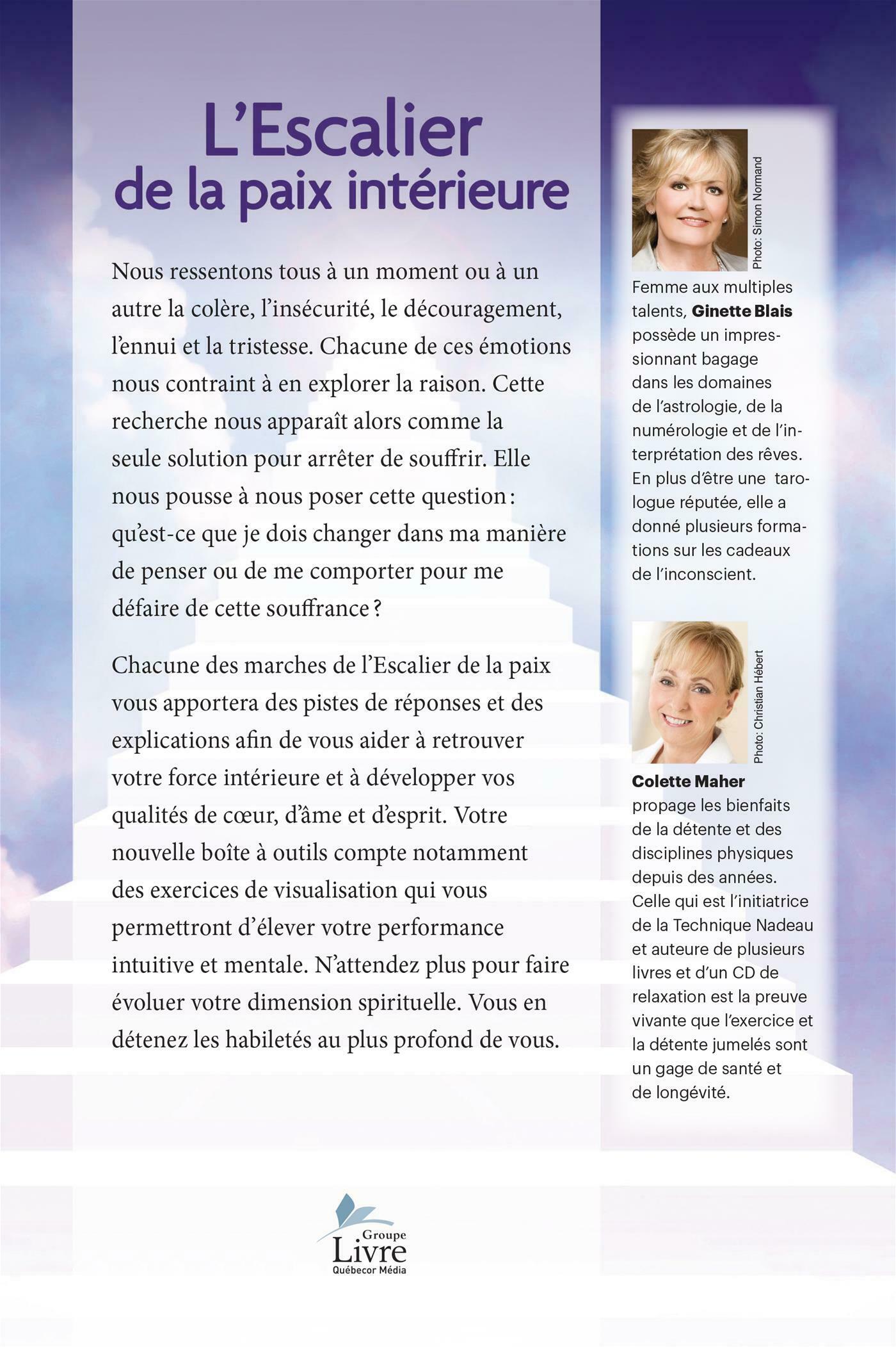 Nous ressentons tous à un moment ou à un autre la colère, l'insécurité, le découragement, l'ennui et la tristesse. Chacune de ces émotions nous contraint à en explorer la raison. Cette recherche nous apparaît alors comme la seule solution pour arrêter de souffrir. Elle nous pousse à nous poser cette question: qu'est-ce que je dois changer dans ma manière de penser ou de me comporter pour me défaire de cette souffrance? . .Chacune des marches de l'Escalier de la paix vous apportera des pistes de réponses et des explications afin de vous aider à retrouver votre force intérieure et à développer vos qualités de coeur, d'âme et d'esprit. Votre nouvelle boîte à outils compte notamment des exercices de visualisation qui vous permettront d'élever votre performance intuitive et mentale. N'attendez plus pour faire évoluer votre dimension spirituelle. Vous en détenez les habiletés au plus profond de vous.
