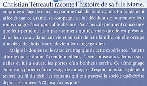 Christian Tétreault raconte l'histoire de sa fille Marie, emportée à l'âge de deux ans par une maladie foudroyante. Profondément affectés par ce drame, sa compagne et lui décident de poursuivre leur route, malgré l'insupportable absence. Peu à peu, ils prennent conscience que leur petite ne les a pas vraiment quittés, mais qu'elle est présente dans leur cœur, dans leur vie et au sein de leur famille, où elle occupe une place de choix. Marie devient leur ange gardien. Malgré tout, l'auteur affirme que ce drame l'a rendu meilleur, l'a sensibilisé aux valeurs essentielles et lui a ouvert les portes d'un bonheur serein.