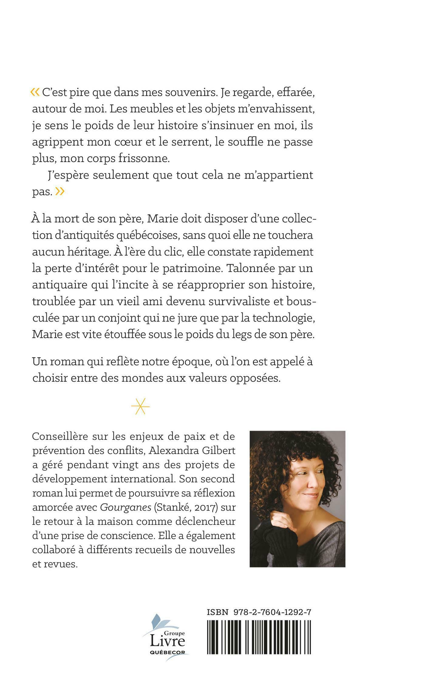 À la mort de son père, Marie doit disposer d'une collection d'antiquités québécoises, sans quoi elle ne touchera aucun héritage. À l'ère du clic, elle constate rapidement la perte d'intérêt pour le patrimoine. Talonnée par un antiquaire qui l'incite à se réapproprier son histoire, troublée par un vieil ami devenu survivaliste et bousculée par un conjoint qui ne jure que par la technologie, Marie est vite étouffée sous le poids du legs de son père.