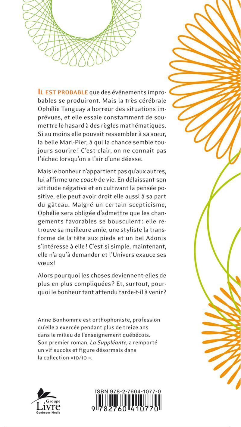 Il est probable que des événements improbables se produiront. Mais la très cérébrale Ophélie Tanguay a horreur des situations imprévues, et elle essaie constamment de soumettre le hasard à des règles mathématiques. Si au moins elle pouvait ressembler à sa soeur, la belle Mari-Pier, à qui la chance semble toujours sourire ! C'est clair, on ne connaît pas l'échec lorsqu'on a l'air d'une déesse.