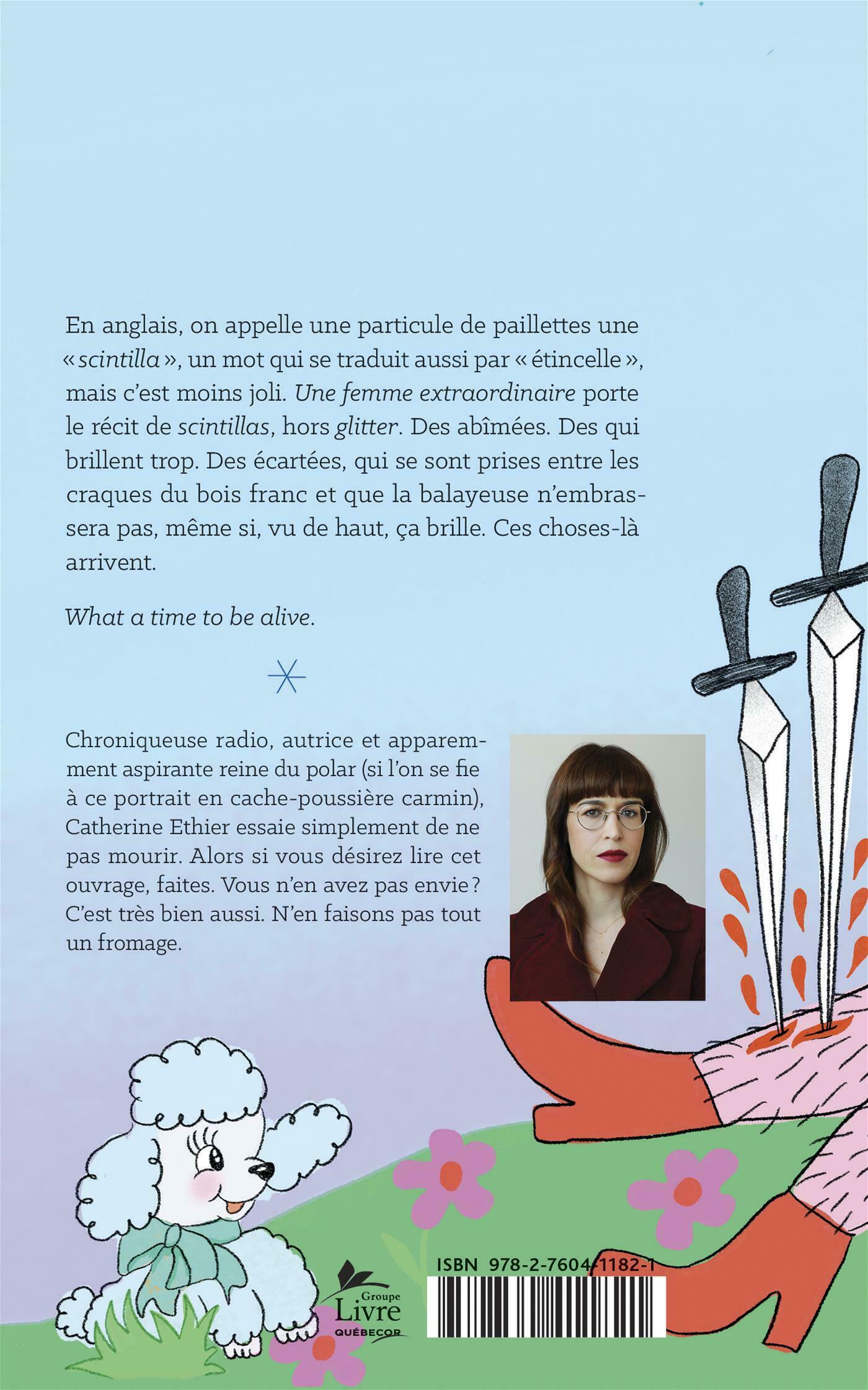 En anglais, on appelle une particule de paillettes une « scintilla », un mot qui se traduit aussi par « étincelle », mais c'est moins joli. Une femme extraordinaire porte le récit de scintillas, hors glitter. Des abîmées. Des qui brillent trop. Des écartées, qui se sont prises entre les craques du bois franc et que la balayeuse n'embrassera pas, même si, vu de haut, ça brille. Ces choses-là arrivent.