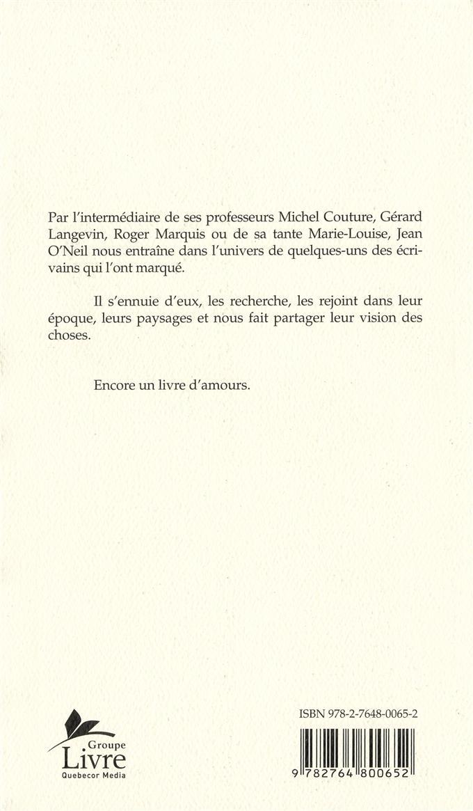 Jean O'Neil, cet incorrigible curieux, cherche toujours les réponses aux nombreuses questions que fait surgir son sens de l'observation aigu. Jean O'Neil nous raconte avec bonheur sa redécouverte des auteurs qu'il a aimés, à travers les lieux qui les ont vus naître ou grandir. Nous retrouvons par exemple la Picardie de Claudel, la Normandie de Maupassant, ou encore le Sud de Valéry, pour ne citer que ceux-là… Éternel amoureux du Québec s'il en est, Jean O'Neil nous fait le plaisir d'associer dans son parcours les lieux de mémoire et de cœur de son Québec natal.