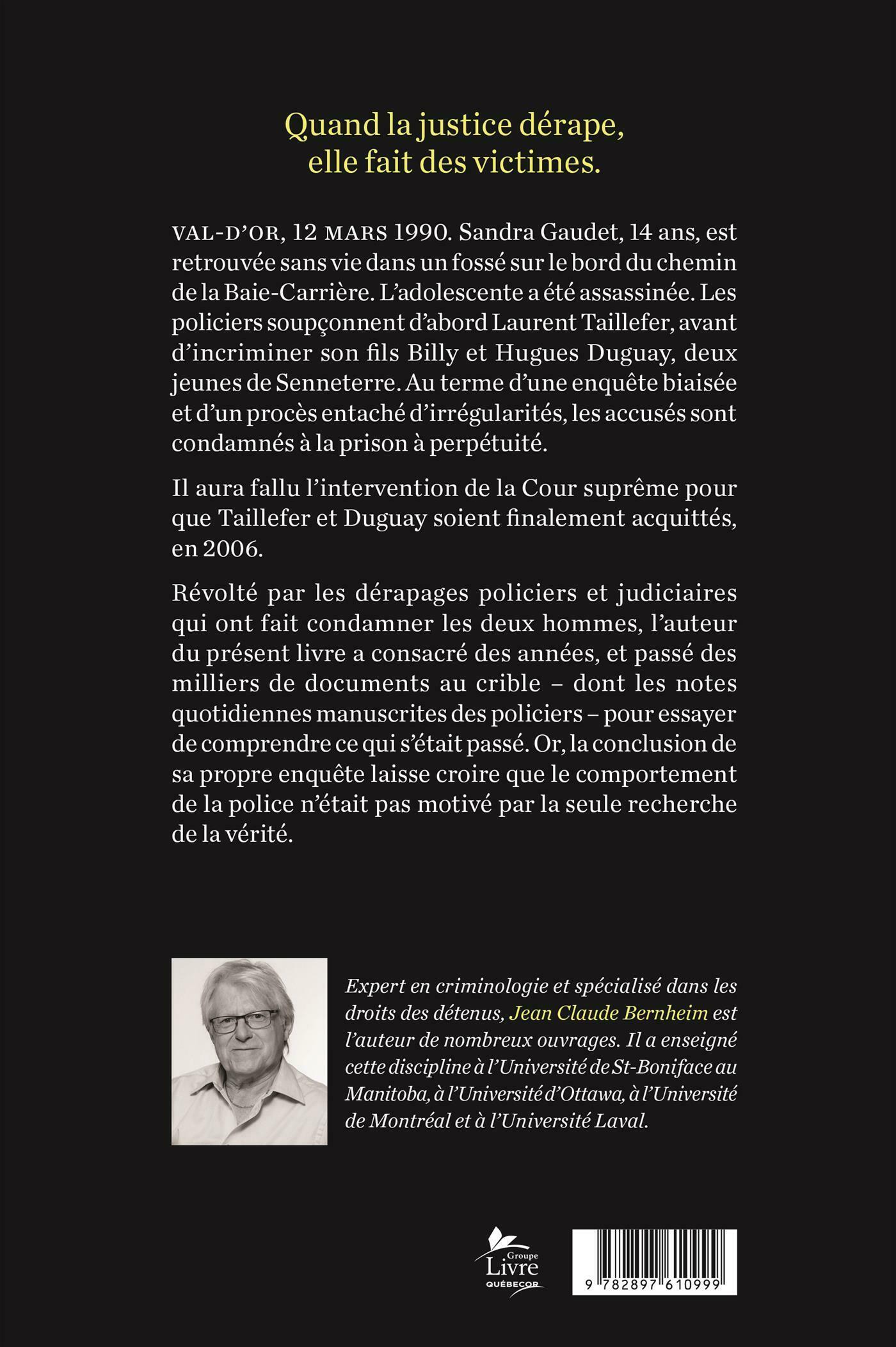 Val-d'Or, 12 mars 1990. Sandra Gaudet, 14 ans, est retrouvée sans vie dans un fossé sur le bord du chemin de la Baie-Carrière. L'adolescente a été assassinée. Les policiers soupçonnent d'abord Laurent Taillefer, avant d'incriminer son fils Billy et Hugues Duguay, deux jeunes de Senneterre. Au terme d'une enquête biaisée et d'un procès entaché d'irrégularités, les accusés sont condamnés à la prison à perpétuité.