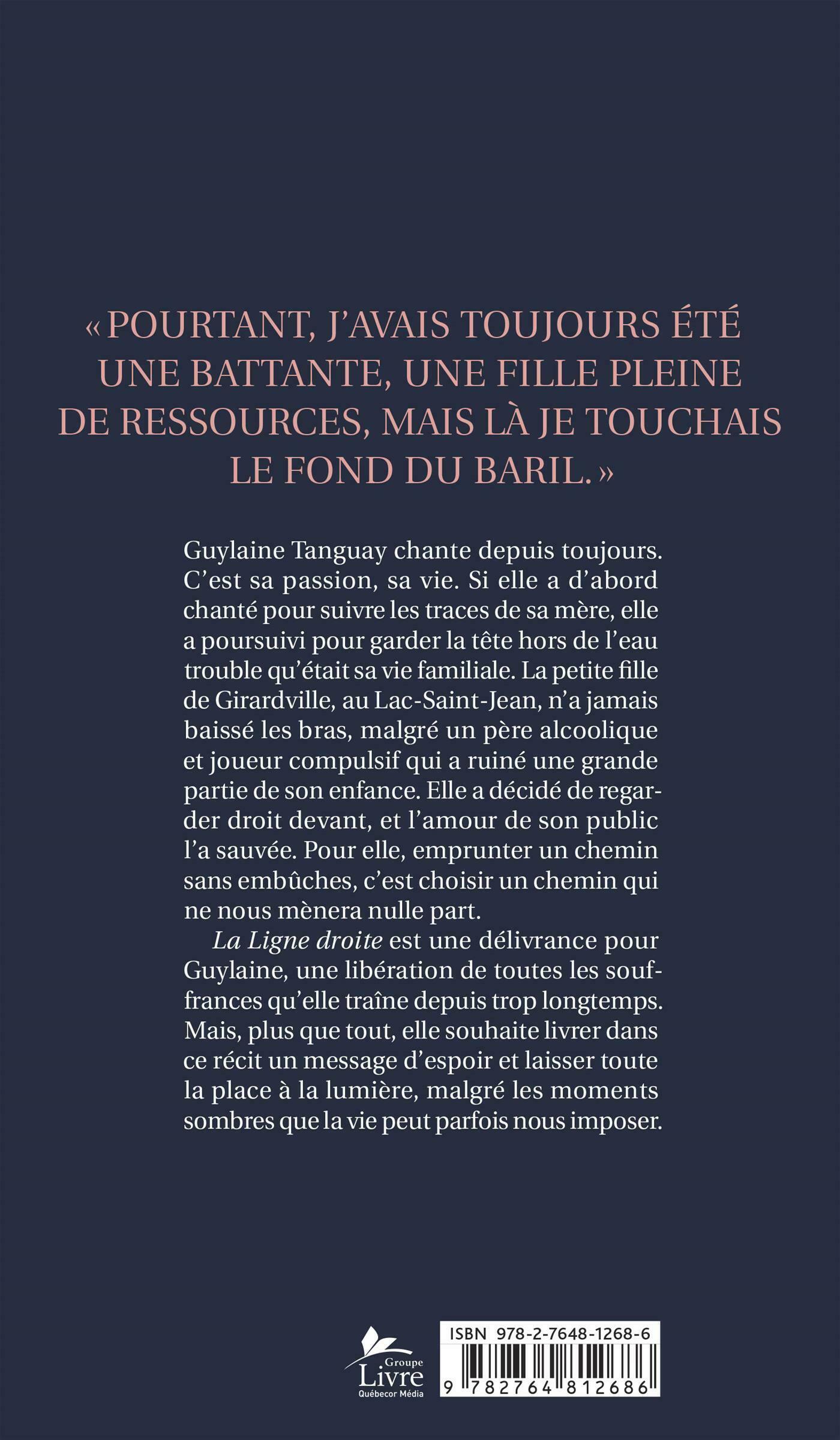 .La Ligne droite est une délivrance pour Guylaine, une libération de toutes les souffrances qu'elle traîne depuis trop longtemps. Mais plus que tout, elle souhaite livrer dans ce récit un message d'espoir et laisser toute la place à la lumière, malgré les moments sombres que la vie peut parfois nous imposer.