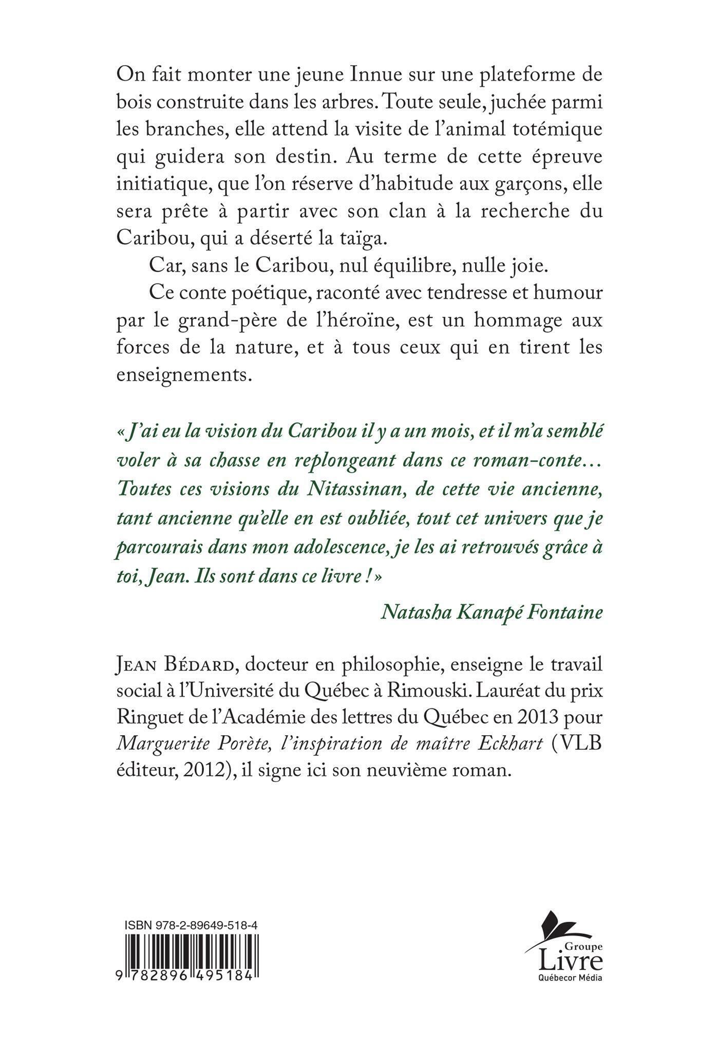 On fait monter une jeune Innue sur une plateforme de bois construite dans les arbres. Toute seule, juchée parmi les branches, elle attend la visite de l'animal totémique qui guidera son destin. Au terme de cette épreuve initiatique, que l'on réserve d'habitude aux garçons, elle sera prête à partir avec son clan à la recherche du caribou, qui a déserté la taïga.Car, sans le caribou, nul équilibre, nulle joie. Ce conte poétique, raconté avec tendresse et humour par le grand-père de l'héroïne, est un hommage aux forces de la nature, et à tous ceux qui en tirent les enseignements. . .« J'ai eu la vision du Caribou il y a un mois, et il m'a semblé voler à sa chasse en replongeant dans ce roman-conte… Toutes ces visions du Nitassinan, de cette vie ancienne, tant ancienne qu'elle en est oubliée, tout cet univers que je parcourais dans mon adolescence, je les ai retrouvés grâce à toi, Jean. Ils sont dans ce livre ! » . .- Natasha Kanapé Fontaine