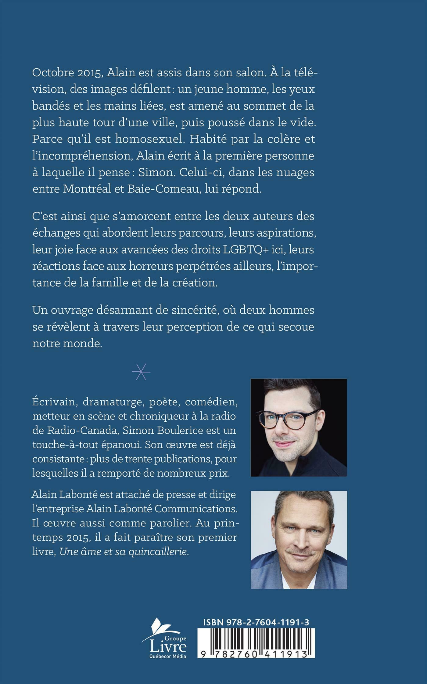 Octobre 2015, Alain est assis dans son salon. À la télévision, des images défilent : un jeune homme, les yeux bandés et les mains liées, est amené au sommet de la plus haute tour d'une ville, puis poussé dans le vide. Parce qu'il est homosexuel. Habité par la colère et l'incompréhension, Alain écrit à la première personne à laquelle il pense : Simon. Celui-ci, dans les nuages entre Montréal et Baie-Comeau, lui répond. . .C'est ainsi que s'amorcent entre les deux auteurs des échanges qui abordent leurs parcours, leurs aspirations, leur joie face aux avancées des droits LGBTQ ici, leurs réactions face aux horreurs perpétrées ailleurs, l'importance de la famille et de la création. . .Un ouvrage désarmant de sincérité, où deux hommes se révèlent à travers leur perception de ce qui secoue notre monde.