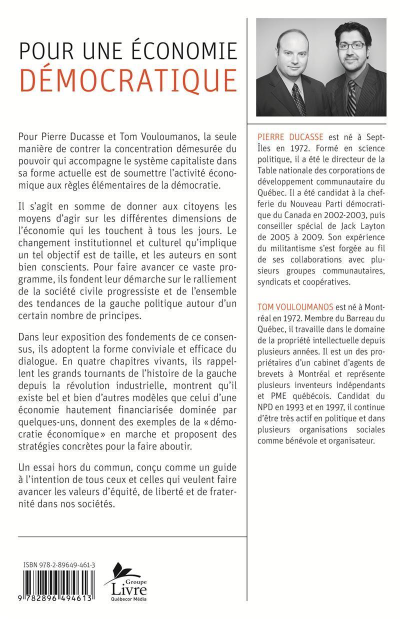 Pour Pierre Ducasse et Tom Vouloumanos, la seule manière de contrer la concentration démesurée du pouvoir qui accompagne le système capitaliste dans sa forme actuelle est de soumettre l'activité économique aux règles élémentaires de la démocratie. Il s'agit en somme de donner aux citoyens les moyens d'agir sur les différentes dimensions de l'économie qui les touchent à tous les jours. Le changement institutionnel et culturel qu'implique un tel objectif est de taille, et les auteurs en sont bien conscients. Pour faire avancer ce vaste programme, ils fondent leur démarche sur le ralliement de la société civile progressiste et de l'ensemble des tendances de la gauche politique autour d'un certain nombre de principes. Dans leur exposition des fondements de ce consensus, ils adoptent la forme conviviale et efficace du dialogue. En quatre chapitres vivants, ils rappellent les grands tournants de l'histoire de la gauche depuis la révolution industrielle, montrent qu'il existe bel et bien d'autres modèles que celui d'une économie hautement financiarisée dominée par quelques-uns, donnent des exemples de la « démocratie économique » en marche et proposent des stratégies concrètes pour la faire aboutir. Un essai hors du commun, conçu comme un guide à l'intention de tous ceux et celles qui veulent faire avancer les valeurs d'équité, de liberté et de fraternité dans nos sociétés.