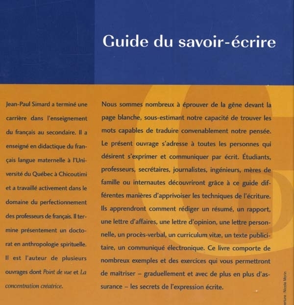 Nous sommes nombreux à éprouver de la gêne devant la page blanche, sous-estimant notre capacité de trouver les mots capables de traduire convenablement notre pensée. Le présent ouvrage s’adresse à toutes les personnes qui désirent s’exprimer et communiquer par écrit. Étudiants, professeurs, secrétaires, journalistes, ingénieurs, mères de famille ou internautes découvriront grâce à ce guide différentes manières d’apprivoiser les techniques de l’écriture. Ils apprendront comment rédiger un résumé, un rapport, une lettre d’affaires, une lettre d’opinion, une lettre personnelle, un procès-verbal, un curriculum vitæ, un texte publicitaire, un communiqué électronique. Ce livre comporte de nombreux exemples et des exercices qui vous permettront de maîtriser – graduellement et avec de plus en plus d’assurance – les secrets de l’expression