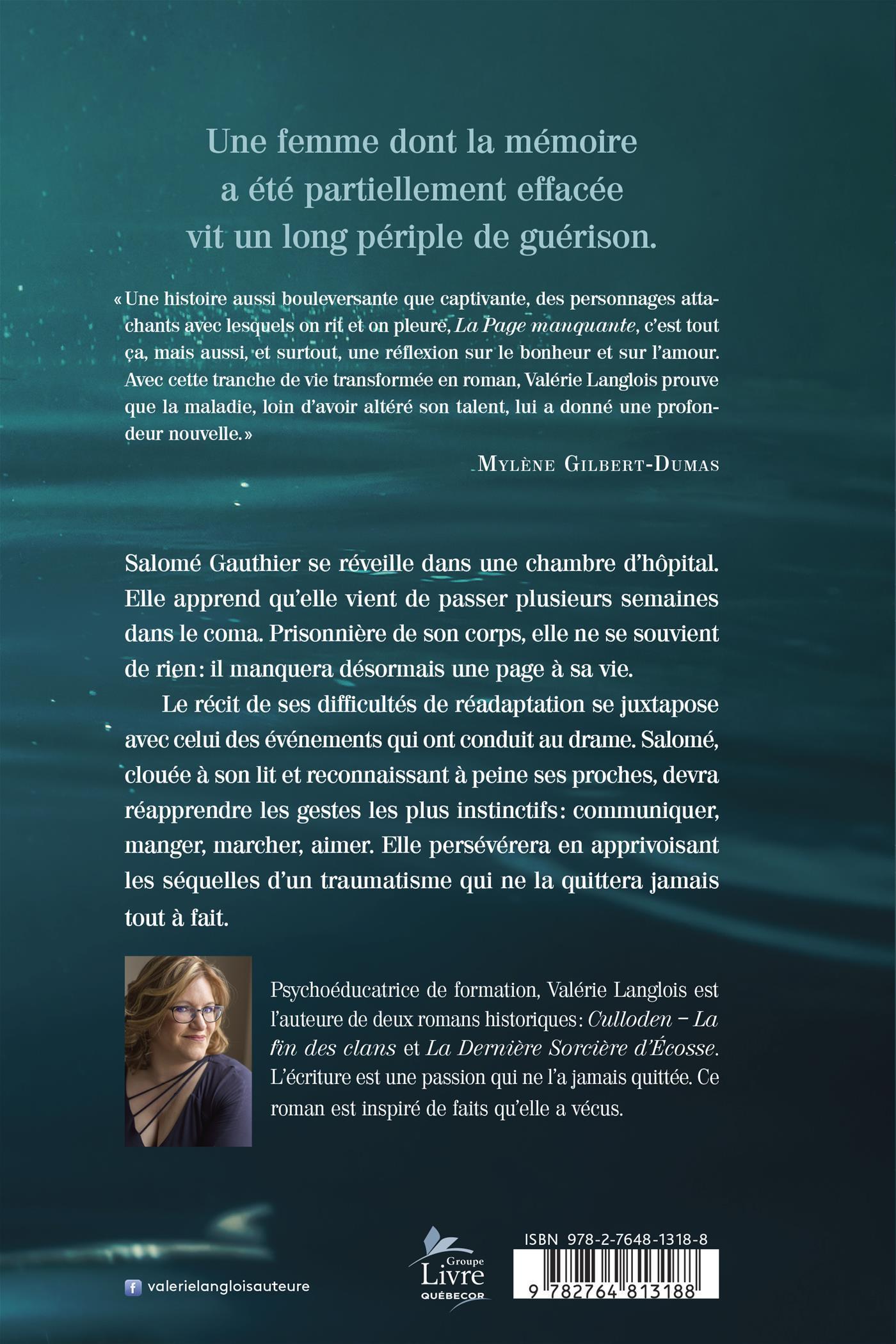 « Une histoire aussi bouleversante que captivante, des personnages attachants avec lesquels on rit et on pleure, La Page manquante, c'est tout ça, mais aussi, et surtout, une réflexion sur le bonheur et sur l'amour. Avec cette tranche de vie transformée en roman, Valérie Langlois prouve que la maladie, loin d'avoir altéré son talent, lui a donné une profondeur nouvelle. »