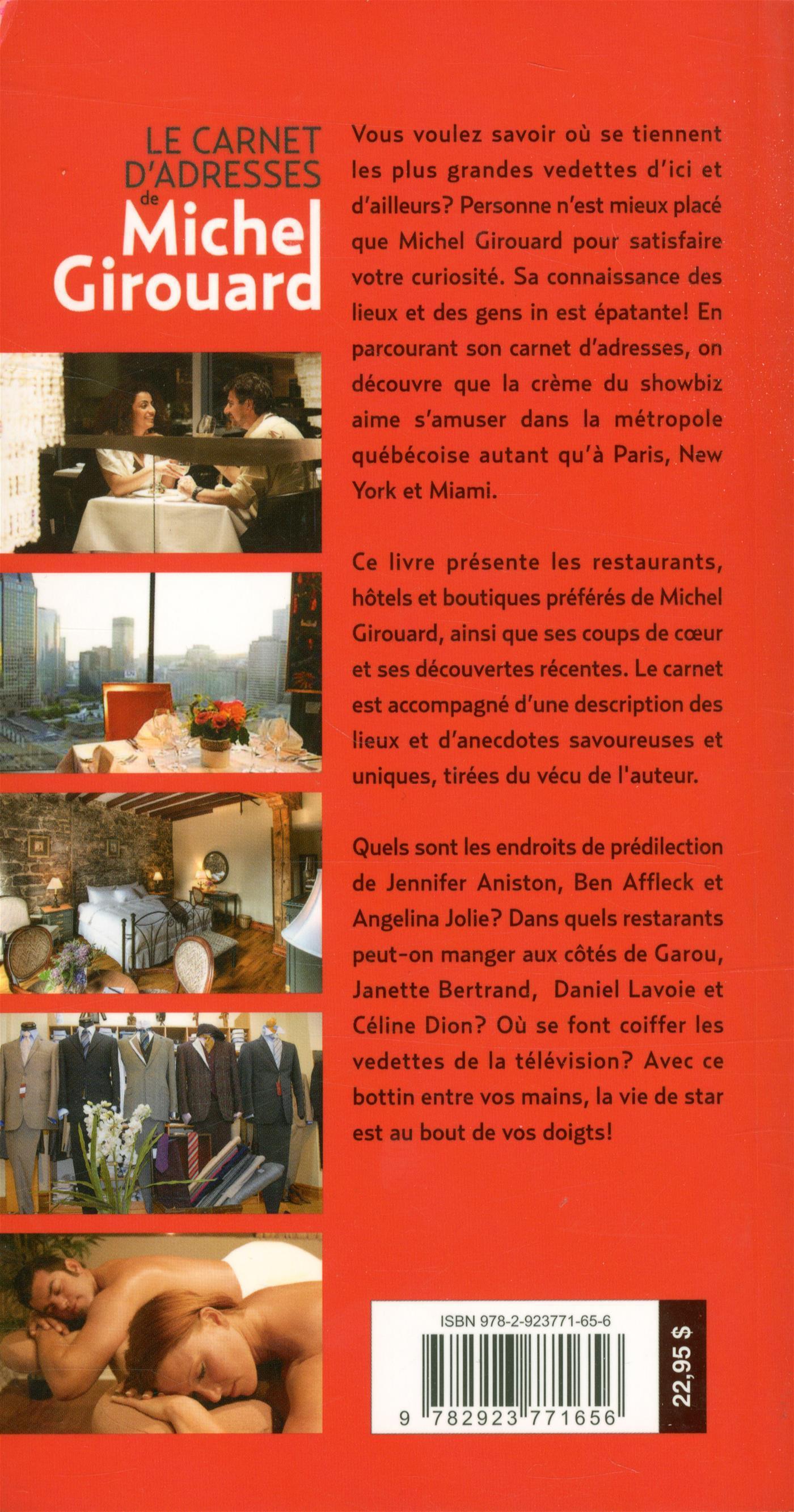 Les lieux branchés, le jet-set, il connaît. C’est sa spécialité. Vous voulez savoir où apercevoir les plus grandes vedettes internationales et d’ici? Michel Girouard est votre homme. Personne au Québec n’est mieux placé que lui dans ce domaine. Sa connaissance des lieux et des gens in est remarquable. Grâce à lui, on se rend compte que Montréal n’a rien à envier à Paris, New York ou Monaco. La crème du showbiz et les stars les plus sexy adorent s’amuser dans la métropole québécoise, tout autant que dans ces villes internationales. Enfin accessibles au grand public, voici les bonnes adresses de Michel Girouard, les coordonnées de ses restaurants, hôtels et boutiques préférés, ses coups de coeur, ses découvertes récentes, etc. Ce carnet est accompagné d’une description des lieux et d’anecdotes savoureuses et uniques, car elles concernent le vécu de Michel Girouard. Il en profite pour dévoiler les endroits préférés de Jennifer Aniston, Halle Berry, Bradley Cooper, Ben Affleck, Calvin Klein, Angelina Jolie et Brad Pitt, entre autres! Sans oublier notre propre constellation de vedettes québécoises, qui partagent ses lieux de prédilection hot et branchés. Michel les connaît tous! Grâce à son carnet d’adresses, la vie des stars est au bout des doigts du lecteur.