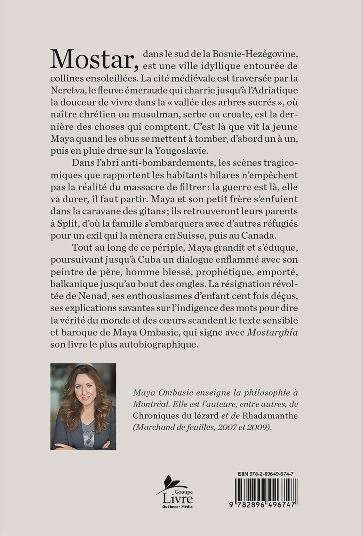 Tout au long de ce périple, Maya grandit et s'éduque, poursuivant jusqu'à Cuba un dialogue enflammé avec son peintre de père, homme blessé, prophétique, emporté, balkanique jusqu'au bout des ongles. La résignation révoltée de Nenad, ses enthousiasmes d'enfant cent fois déçus, ses explications savantes sur l'indigence des mots pour dire la vérité du monde et des cœurs scandent le texte sensible et baroque de Maya Ombasic, qui signe avec Mostarghia son livre le plus autobiographique.