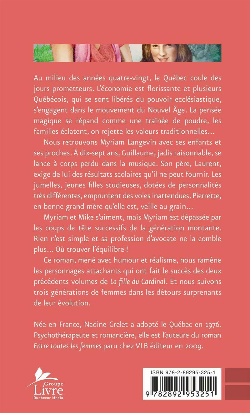 Au milieu des années quatre-vingt, le Québec coule des jours prometteurs. L'économie est florissante et plusieurs Québécois, qui se sont libérés du pouvoir ecclésiastique, s'engagent dans le mouvement du nouvel âge. La pensée magique se répand comme une traînée de poudre, les familles éclatent, on rejette les valeurs traditionnelles... ..Nous retrouvons Myriam Langevin avec ses enfants et ses proches. À dix-sept ans, Guillaume, jadis raisonnable, se lance à corps perdu dans la musique. Son père, Laurent, exige de lui des performances scolaires qu'il ne peut fournir. Les jumelles, jeunes filles studieuses mais dotées de personnalités très différentes, empruntent des voies inattendues. Pierrette, comme une bonne grand-mère, veille au grain... ..Myriam et Mike s'aiment, mais Myriam est dépassée par les coups de tête successifs de la génération montante. Rien n'est simple et sa profession d'avocate ne la comble plus... Où trouver l'équilibre ? ..Ce roman, mené avec humour et réalisme, nous ramène les personnages attachants qui ont fait le succès des deux précédents volumes de La fille du Cardinal. Et nous suivons trois générations de femmes dans les détours surprenants de leur évolution.