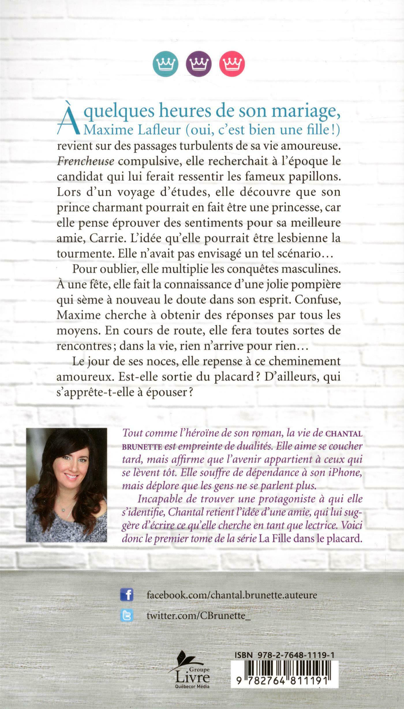 À quelques heures de son mariage, Maxime Lafleur (oui, c'est bien une fille !) revient sur des passages turbulents de sa vie amoureuse. Frencheuse compulsive, elle recherchait à l'époque le candidat qui lui ferait ressentir les fameux papillons. Lors d'un voyage d'études, elle découvre que son prince charmant pourrait en fait être une princesse, car elle pense éprouver des sentiments pour sa meilleure amie, Carrie. L'idée qu'elle pourrait être lesbienne la tourmente. Elle n'avait pas envisagé un tel scénario… . .Pour oublier, elle multiplie les conquêtes masculines. À une fête, elle fait la connaissance d'une jolie pompière qui sème à nouveau le doute dans son esprit. Confuse, Maxime cherche à obtenir des réponses par tous les moyens. En cours de route, elle fera toutes sortes de rencontres ; dans la vie, rien n'arrive pour rien… . .Le jour de ses noces, elle repense à ce cheminement amoureux. Est-elle sortie du placard ? D'ailleurs, qui s'apprête-t-elle à épouser ?