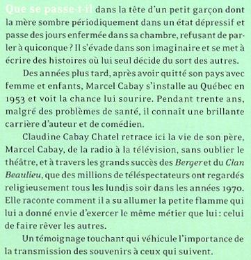 Claudine Cabay Chatel retrace ici la vie de son père, Marcel Cabay, de la radio à la télévision, sans oublier le théâtre, et à travers les grands succès des Berger et du Clan Beaulieu, que des millions de téléspectateurs ont regardés religieusement tous les lundis soir dans les années 1970. Elle raconte comment il a su allumer la petite flamme qui lui a donné envie d'exercer le même métier que lui : celui de faire rêver les autres. Un témoignage touchant qui véhicule l'importance de la transmission des souvenirs à ceux qui suivent.