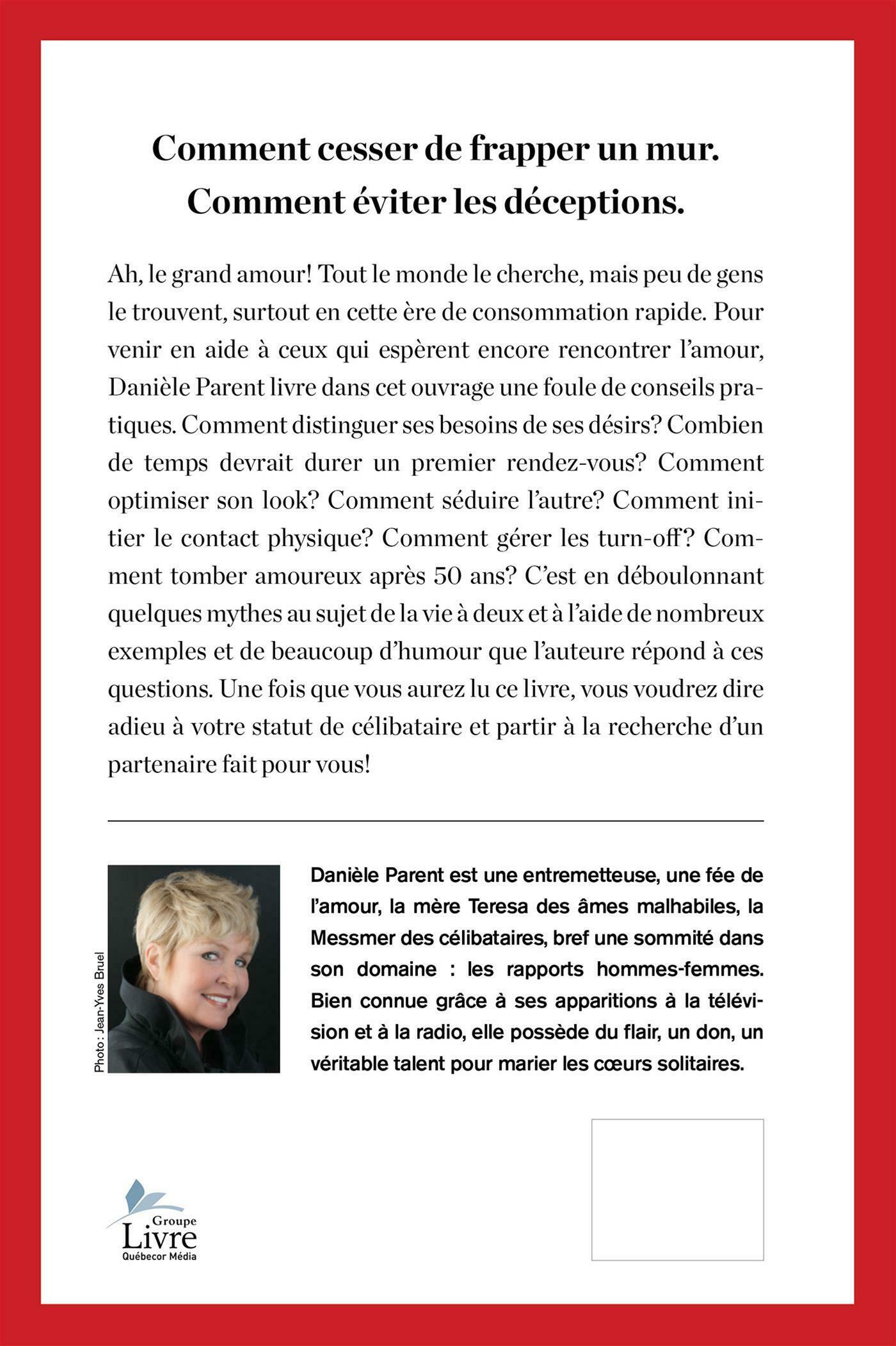 .Ah, le grand amour! Tout le monde le cherche, mais peu de gens le trouvent, surtout en cette ère de consommation rapide. Pour venir en aide à ceux qui espèrent encore rencontrer l'amour, Danièle Parent livre dans cet ouvrage une foule de conseils pratiques. Comment distinguer ses besoins de ses désirs? Combien de temps devrait durer un premier rendez-vous? Comment optimiser son look? Comment séduire l'autre? Comment initier le contact physique? Comment gérer les turn off? Comment tomber amoureux après 50 ans? C'est en déboulonnant quelques mythes au sujet de la vie à deux et à l'aide de nombreux exemples et de beaucoup d'humour que l'auteure répond à ces questions. Une fois que vous aurez lu ce livre, vous voudrez dire adieu à votre statut de célibataire et partir à la recherche du partenaire fait pour vous!