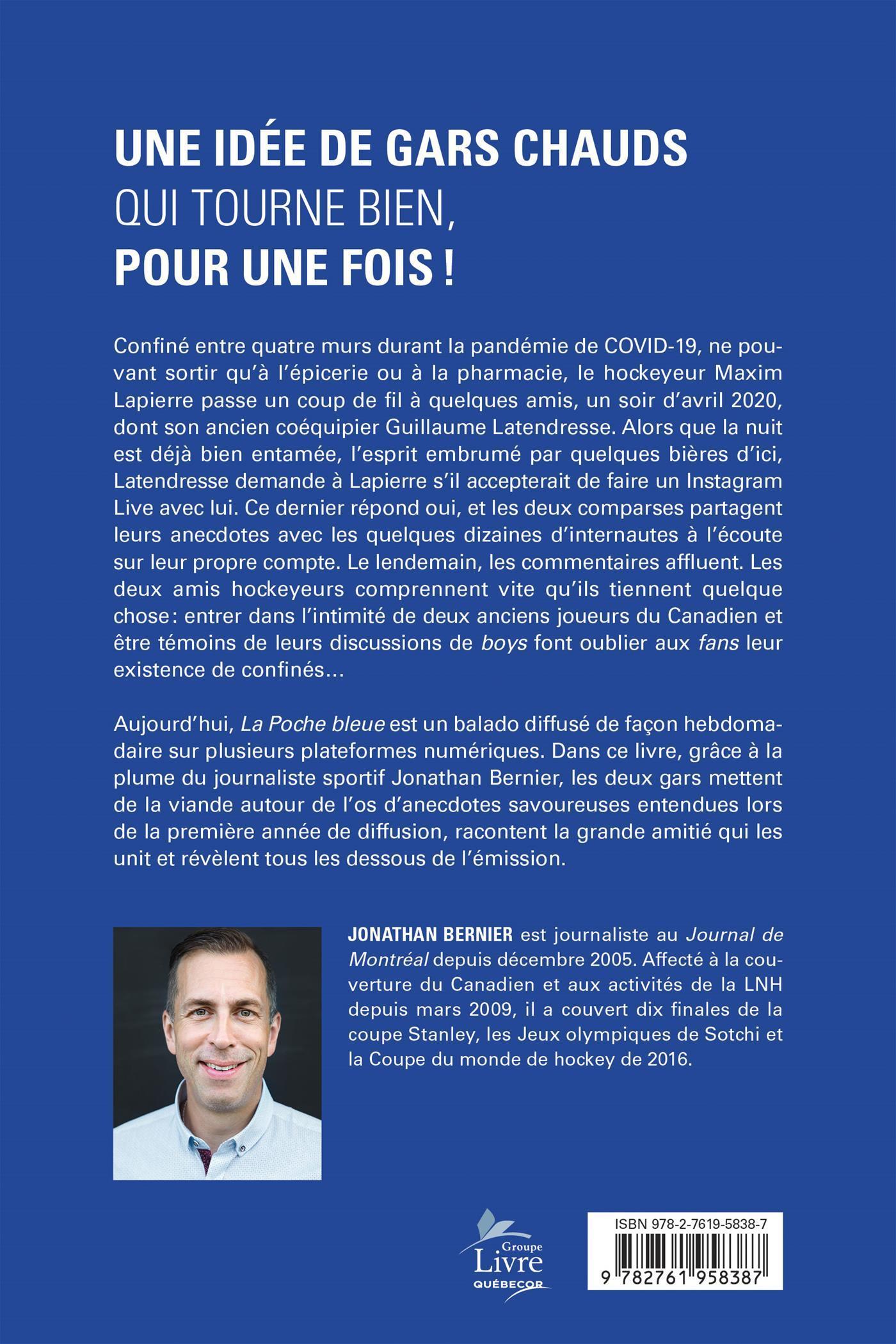 Aujourd'hui, La Poche bleue est un balado diffusé de façon hebdomadaire sur plusieurs plateformes numériques. Dans ce livre, grâce à la plume du journaliste sportif Jonathan Bernier, les deux gars mettent de la viande autour de l'os d'anecdotes savoureuses entendues lors de la première année de diffusion, racontent la grande amitié qui les unit et révèlent tous les dessous de l'émission.