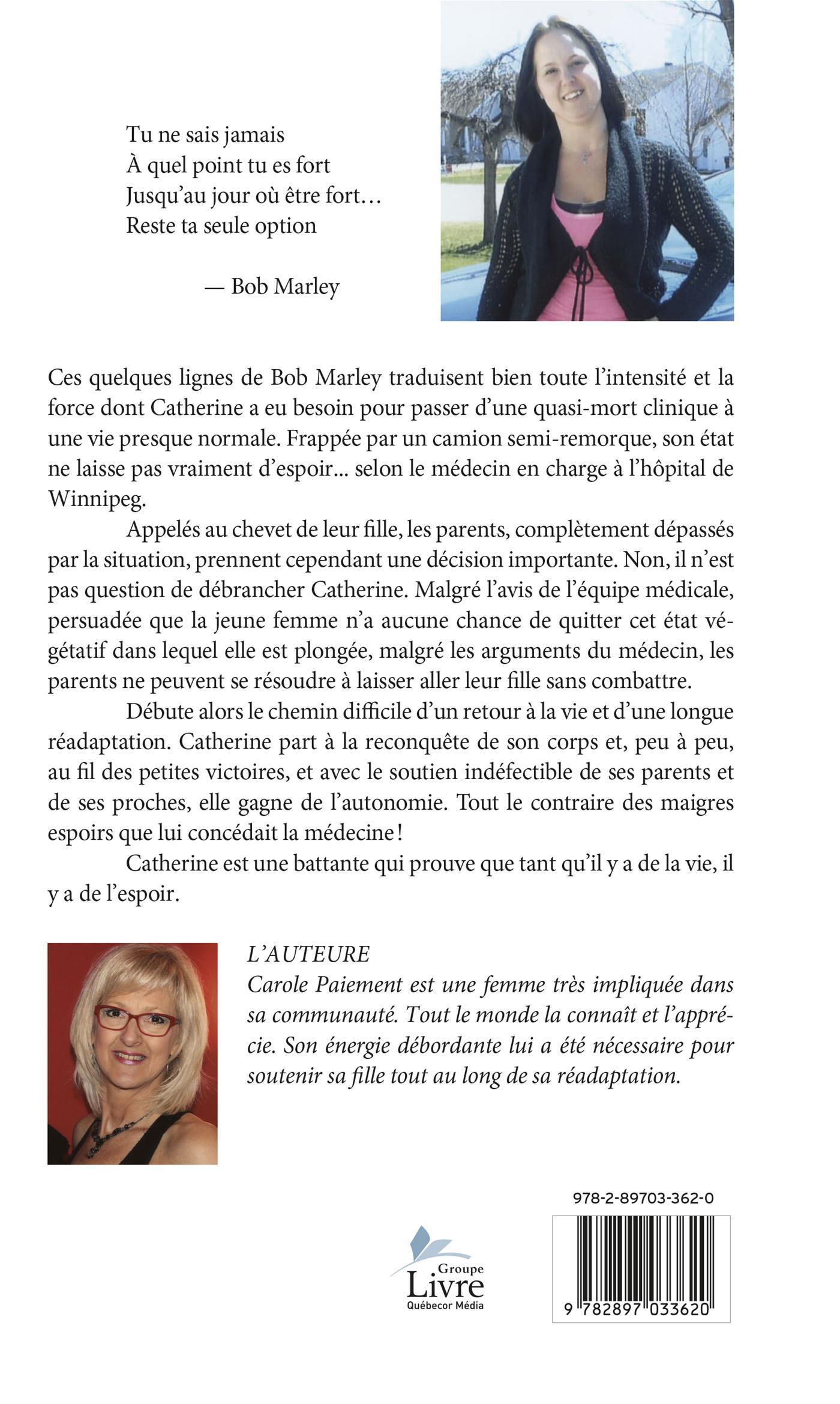 Ces quelques lignes de Bob Marley traduisent bien toute l'intensité et la force dont Catherine a eu besoin pour passer d'une quasi-mort clinique à une vie presque normale. Frappée par un camion semi-remorque, son état ne laisse pas vraiment d'espoir... selon le médecin en charge à l'hôpital de Winnipeg.