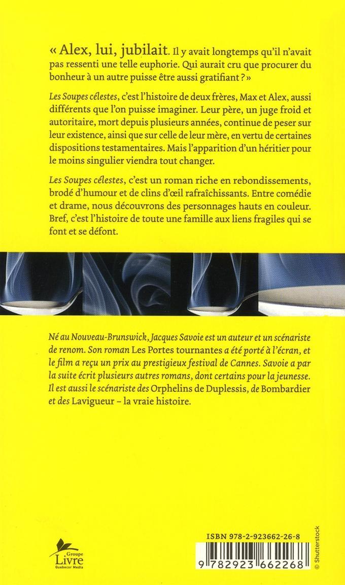 Les Soupes célestes, c’est l’histoire de deux frères, Max et Alex, aussi différents l’un de l’autre que possible. Leur père, un juge froid et autoritaire, mort depuis plusieurs années, continue d’influer sur leur existence, ainsi que sur celle de leur mère, Hélène, en vertu de certaines dispositions testamentaires.Mais voici que la lecture du testament révèle la présence d’un héritier singulier : Achille Murphy, surnommé le Professeur par ses amis clochards de l’accueil du Père. C’est là en effet que cet humaniste de profession reçoit chaque jour sa ration de soupe et de réconfort de la part de sœur Brigitte, femme haute en couleur.Les Soupes célestes, c’est aussi une série de morts et de coups du sort qui feront en sorte de mélanger personnalités et valeurs, tout en révélant les individus à eux-mêmes. Sur un rythme haletant et vif, le roman oscille délicieusement entre la comédie et le drame. Bref, c’est l’histoire de toute une famille aux liens fragiles qui se font et se défont.