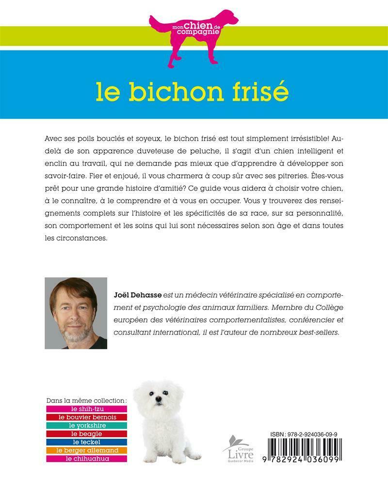 Avec ses poils bouclés et soyeux, le bichon frisé est tout simplement irrésistible! Au-delà de son apparence duveteuse de peluche, il s'agit d'un chien intelligent et enclin au travail, qui ne demande pas mieux que d'apprendre à développer son savoir-faire. Fier et enjoué, il vous charmera à coup sûr avec ses pitreries. Êtes-vous prêt pour une grande histoire d'amitié? Ce guide vous aidera à choisir votre chien, à le connaître, à le comprendre et à vous en occuper. Vous y trouverez des renseignements complets sur l'histoire et les spécificités de sa race, sur sa personnalité, son comportement et les soins qui lui sont nécessaires selon son âge et dans toutes les circonstances.