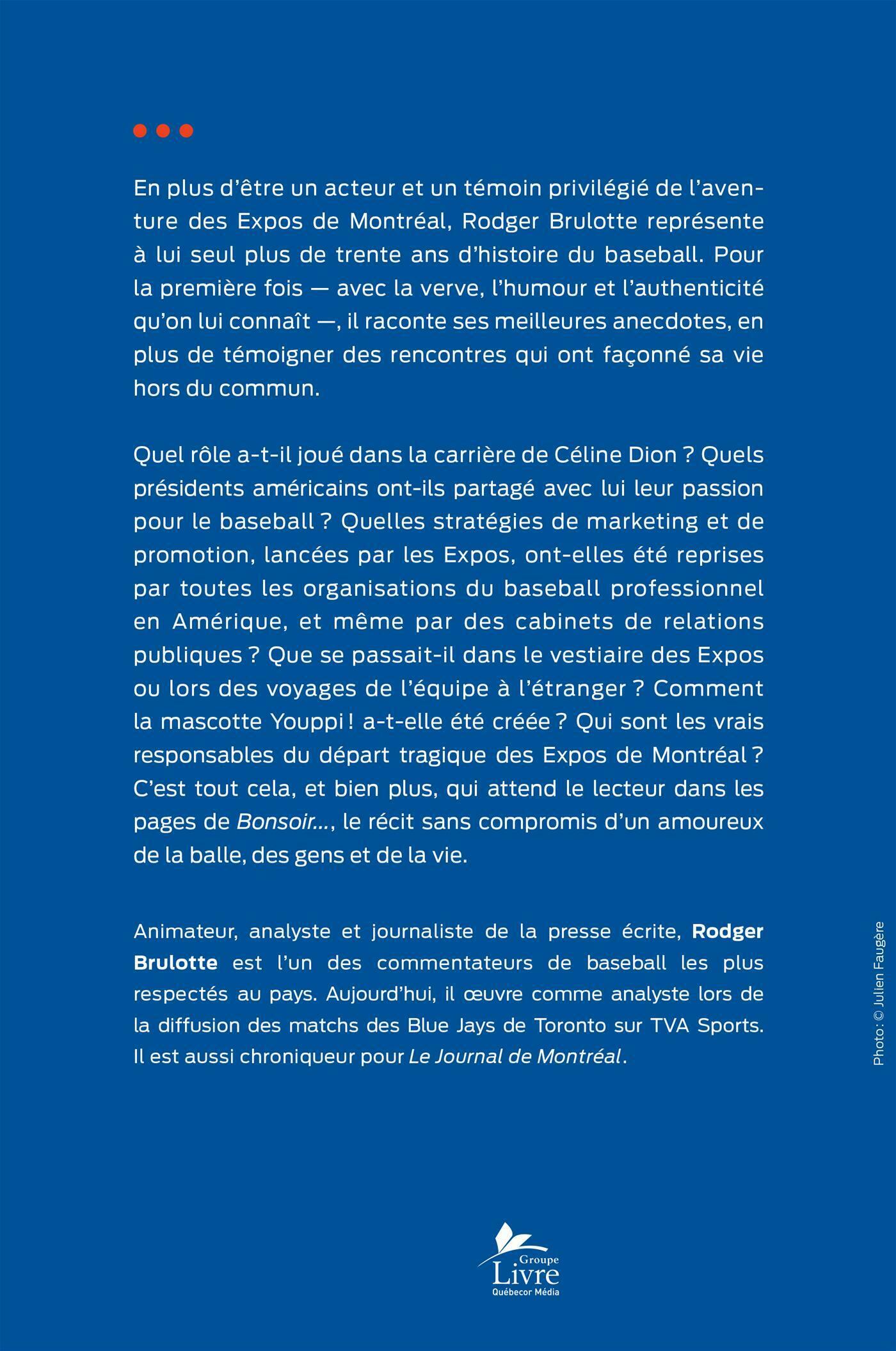 .Quel rôle a-t-il joué dans la carrière de Céline Dion? Quels présidents américains ont-ils partagé avec lui leur passion pour le baseball? Quelles stratégies de marketing et de promotion, lancées par les Expos, ont-elles été reprises par toutes les organisations du baseball professionnel en Amérique, et même par des cabinets de relations publiques? Que se passait-il dans le vestiaire des Exposou lors des voyages de l'équipe à l'étranger? Comment la mascotte Youppi! a-t-elle été créée? Qui sont les vrais responsables du départ tragique des Expos de Montréal? C'est tout cela, et bien plus, qui attend le lecteur dans les pages de Bonsoir..., le récit sans compromis d'un amoureux de la balle, des gens et de la vie.
