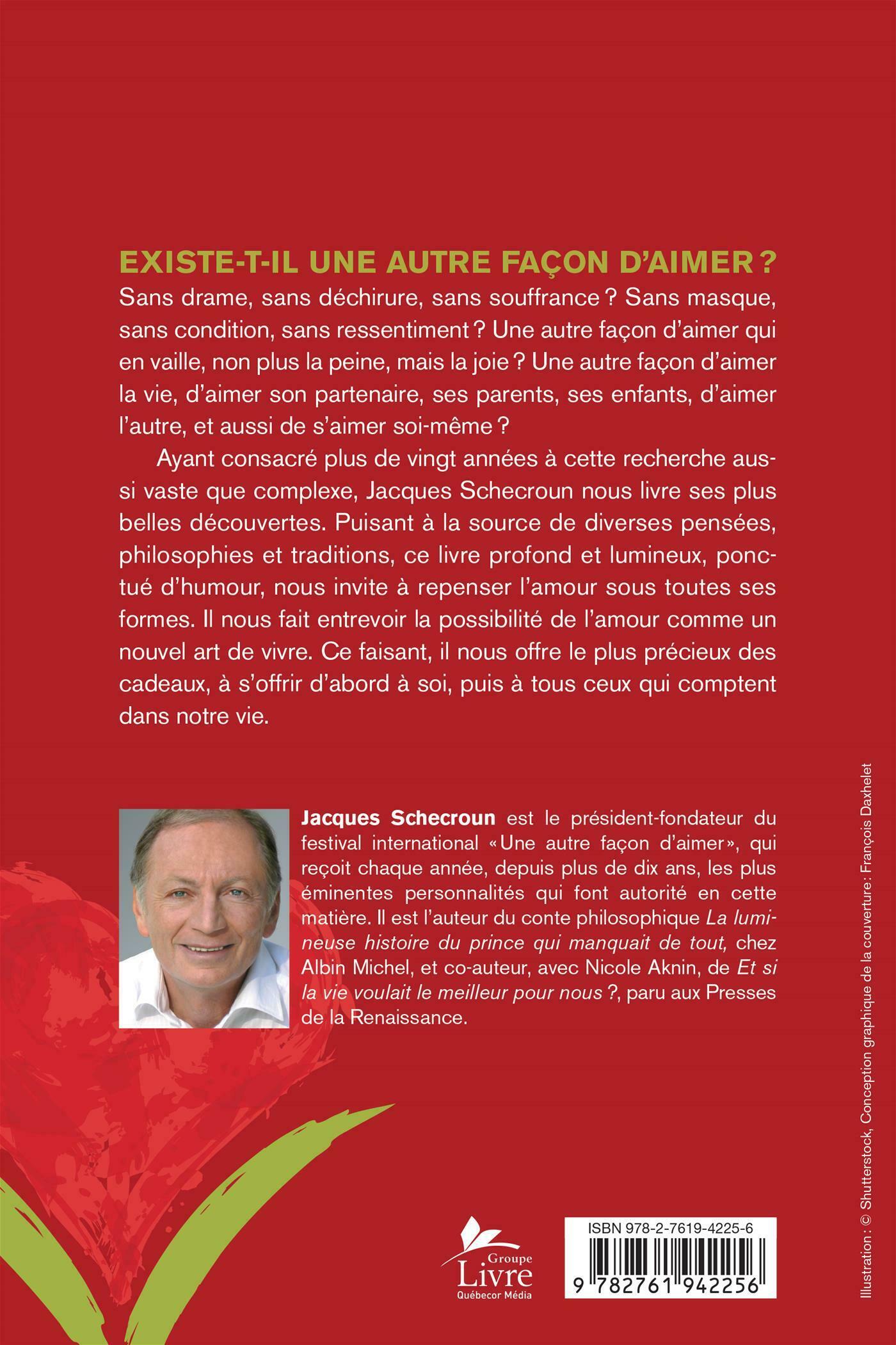 Existe-t-il une autre façon d'aimer? Sans drame, sans déchirure, sans souffrance? Sans masque, sans condition, sans ressentiment? Une autre façon d'aimer qui en vaille, non plus la peine, mais la joie? Une autre façon d'aimer la vie, d'aimer son partenaire, ses parents, ses enfants, d'aimer l'autre, et aussi de s'aimer soi-même? Ayant consacré plus de vingt années à cette recherche aussi vaste que complexe, Jacques Schecroun nous livre ses plus belles découvertes. Puisant à la source de diverses pensées, philosophies et traditions, ce livre profond et lumineux, ponctué d'humour, nous invite à repenser l'amour sous toutes ses formes. Il nous fait entrevoir la possibilité de l'amour comme un nouvel art de vivre. Ce faisant, il nous offre le plus précieux des cadeaux, à s'offrir d'abord à soi, puis à tous ceux qui comptent dans notre vie.
