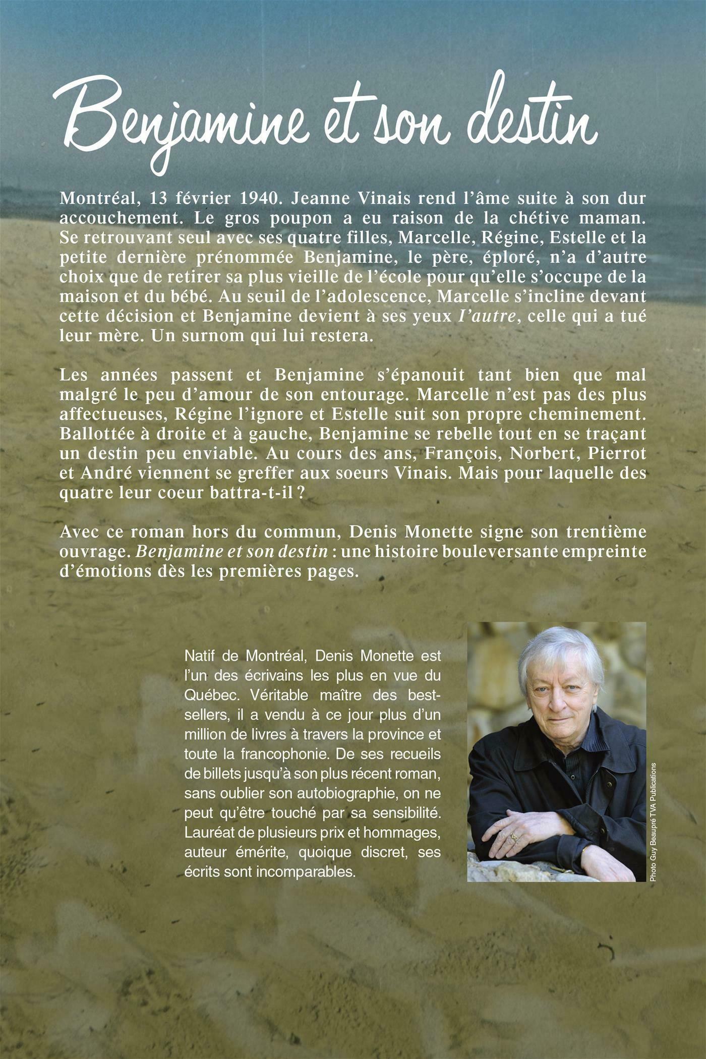 Avec ce roman hors du commun, Denis Monette signe son trentième ouvrage. Benjamine et son destin : une histoire bouleversante empreinte d'émotions dès les premières pages.