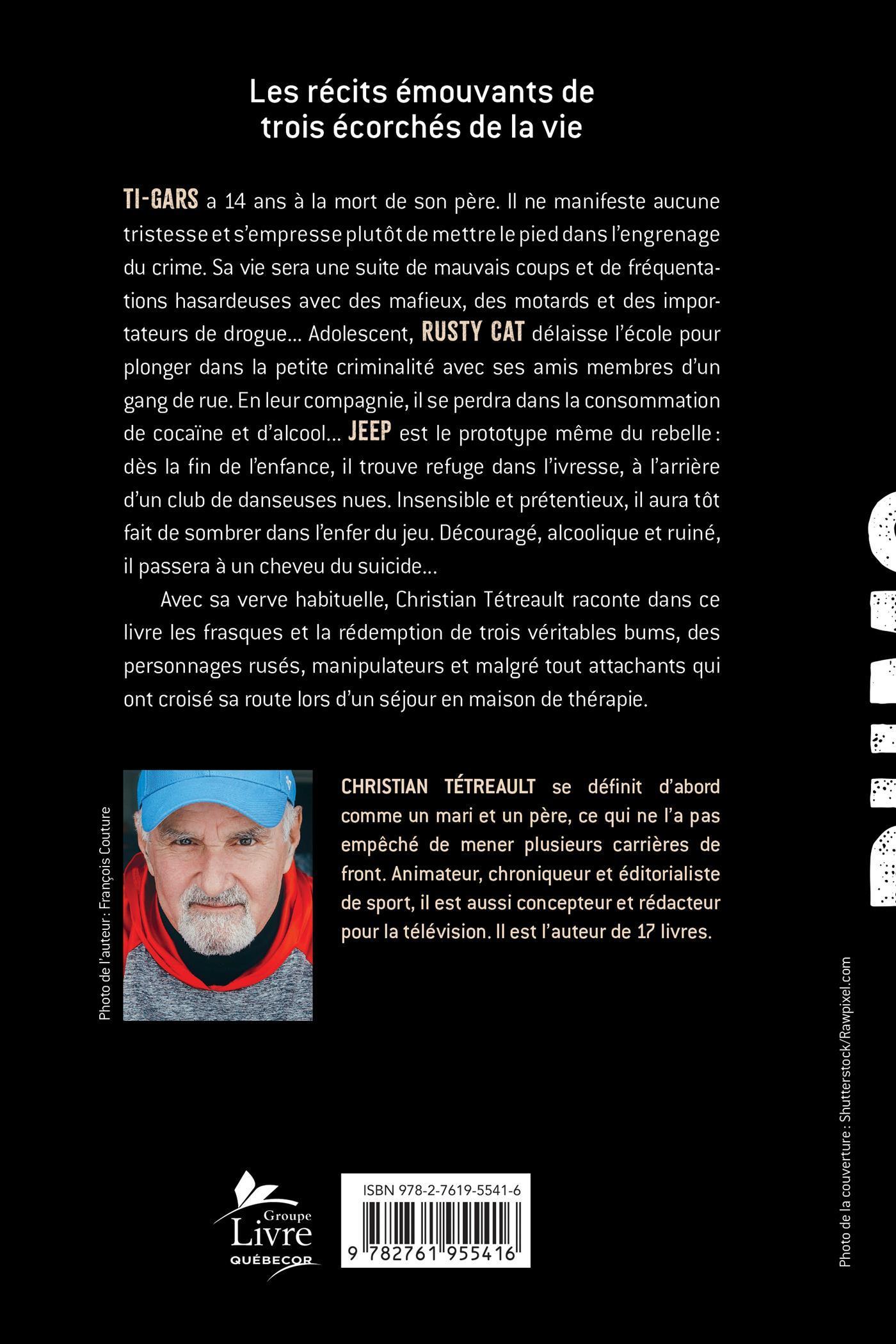 Avec sa verve habituelle, Christian Tétreault raconte dans ce livre les frasques et la rédemption de trois véritables bums, des personnages rusés, manipulateurs et malgré tout attachants qui ont croisé sa route lors d'un séjour en maison de thérapie.