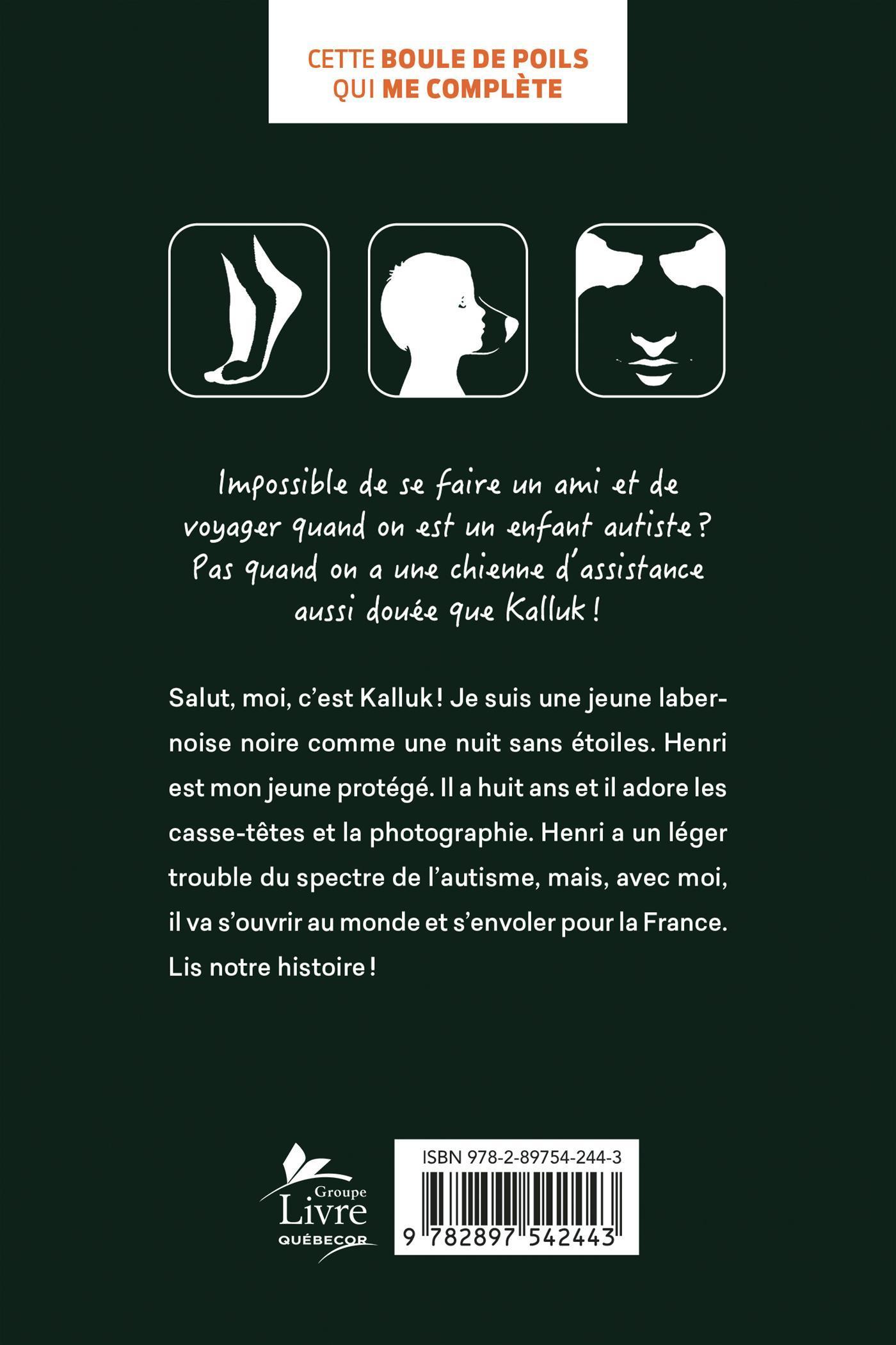 Salut, moi, c'est Kalluk! Je suis une jeune labernoise noire comme une nuit sans étoiles. Henri est mon jeune protégé. Il a huit ans et il adore les casse-têtes et la photographie. Henri a un léger trouble du spectre de l'autisme, mais, avec moi, il va s'ouvrir au monde et s'envoler pour la France. Lis notre histoire!