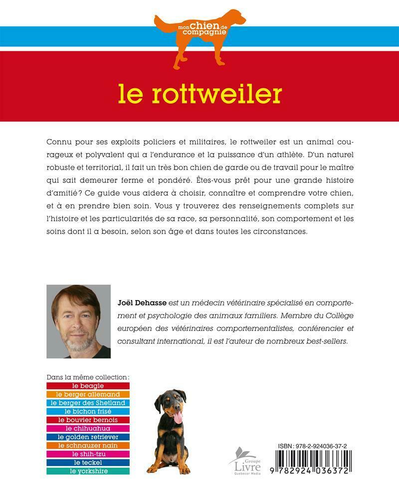Connu pour ses exploits policiers et militaires, le rottweiler est un animal courageux et polyvalent qui a l'endurance et la puissance d'un athlète. D'un naturel robuste et territorial, il fait un très bon chien de garde ou de travail pour le maître qui sait demeurer ferme et pondéré. Êtes-vous prêt pour une grande histoire d'amitié? Ce guide vous aidera à choisir, connaître et comprendre votre chien, et à en prendre bien soin. Vous y trouverez des renseignements complets sur l'histoire et les particularités de sa race, sa personnalité, son comportement et les soins dont il a besoin, selon son âge et dans toutes les circonstances.