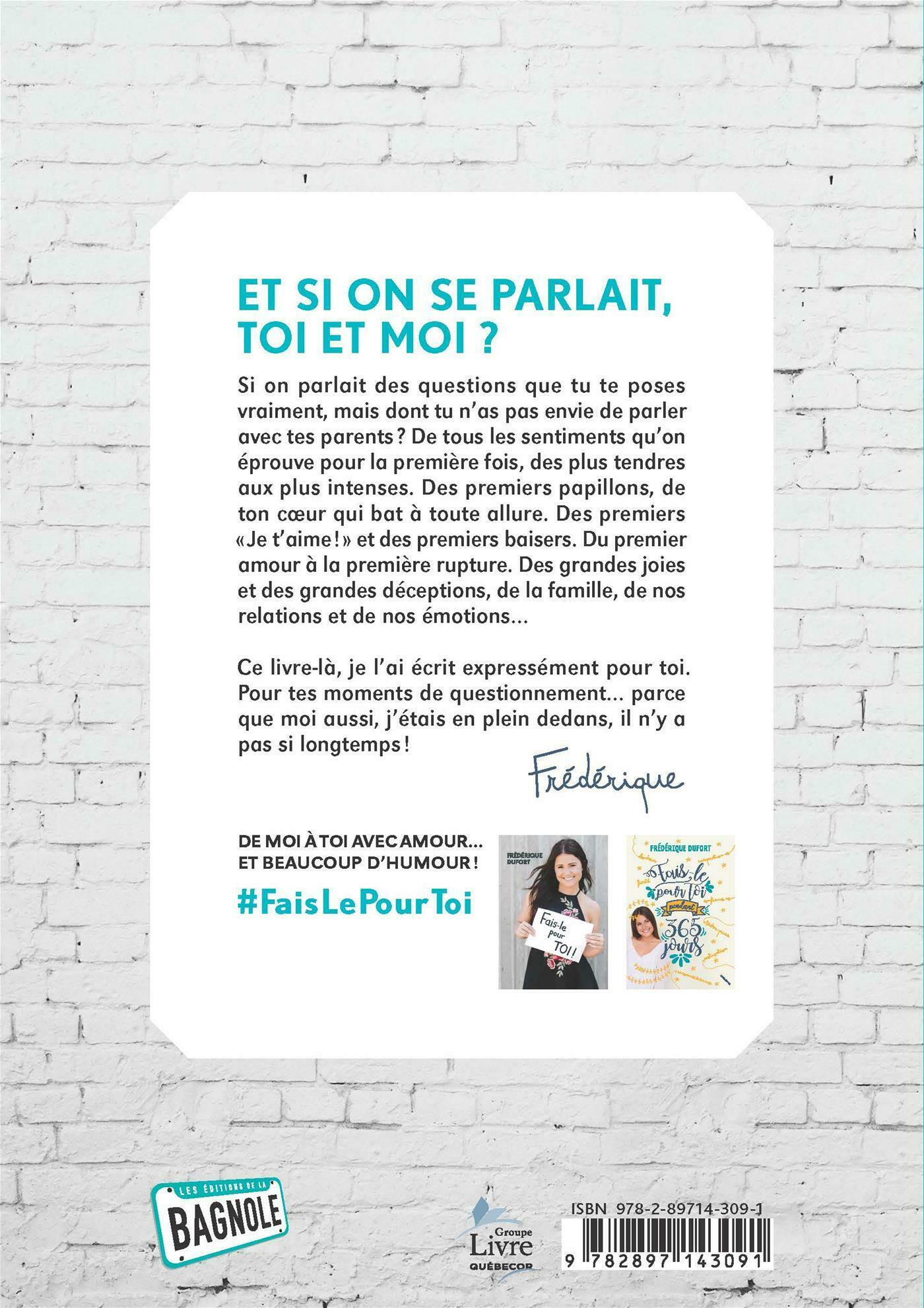.Si on parlait des questions que tu te poses vraiment, mais dont tu n'as pas envie de parler avec tes parents ? De tous les sentiments qu'on éprouve pour la première fois, des plus tendres aux plus intenses. Des premiers papillons, de ton coeur qui bat à toute allure. Des premiers « Je t'aime ! » et des premiers baisers. Du premier amour à la première rupture. Des grandes joies et des grandes déceptions, de la famille, de nos relations et de nos émotions…
