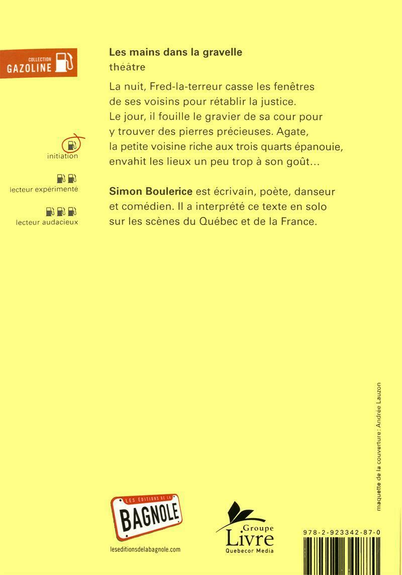 La nuit, Fred-la-terreur casse les fenêtres de ses voisins pour rétablir la justice. Le jour, il fouille le gravier de sa cour pour y trouver des pierres précieuses. Agate, la petite voisine riche aux trois quarts épanouie, envahit les lieux un peu trop à son goût… . .« La vie, chacune de nos vies, se construit à partir de ces petits riens précieux qui nous façonnent. Et Simon Boulerice nous en fait la démonstration flagrante. » .Michel Bélair - Le Devoir