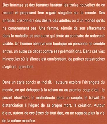 Des hommes et des femmes hantent les treize nouvelles de ce recueil et proposent leur regard singulier sur le monde. Des enfants, prisonniers des désirs des adultes ou d'un monde qu'ils ne comprennent pas. Une femme, témoin de son effacement dans la maladie, et une autre qui tente au contraire de redevenir visible. Un homme observe une boutique où personne ne semble entrer, un autre se débat contre ses prémonitions. Dans ces vies minuscules où le silence est omniprésent, de petites catastrophes s'agitent, grondent. Dans un style concis et incisif, l'auteure explore l'étrangeté du monde, ce qui échappe à la raison ou au premier coup d'oeil, le secret étouffant, le malentendu dans un couple, le travail de distanciation à l'égard de sa propre mort, la création. Autour d'eux, autour de ces êtres de tout âge, on ne regarde plus la vie de la même manière.
