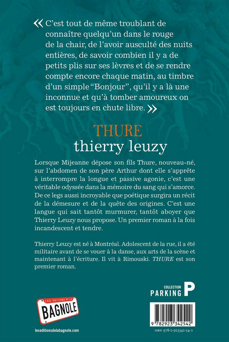 Lorsque Mijeanne dépose son fils Thure, nouveau-né, sur l'abdomen de son père Arthur dont elle s'apprête à interrompre la longue et passive agonie, c'est une véritable odyssée dans la mémoire du sang qui s'amorce. De ce legs aussi incroyable que poétique surgira un récit de la démesure et de la quête des origines. C'est une langue qui sait tantôt murmurer, tantôt aboyer que Thierry Leuzy nous propose. Un premier roman à la fois incandescent et tendre.