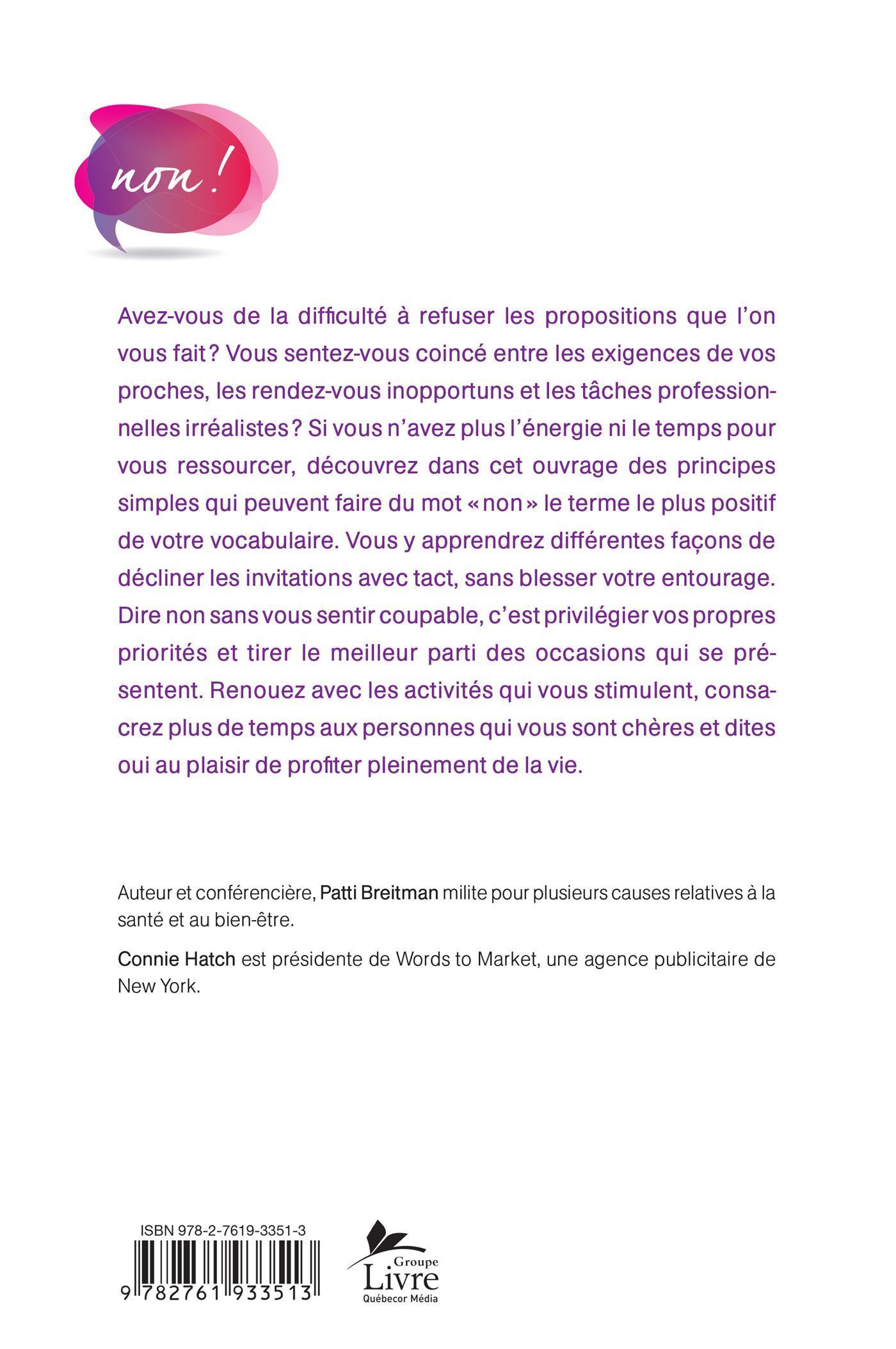 Introduction : Le pouvoir du non Dire non : l'essentiel Dire non aux demandes d'argent Dire non sur son lieu de travail Dire non aux invitations, rendez-vous et liaisons compliquées Dire non aux membres de la famille ou aux amis Dire non aux enfants Dire non aux personnes difficiles Les non de tous les joursCollection : NON CLASSE