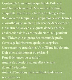 Confrontée à un mariage qui bat de l'aile et à un échec professionnel, Marguerite Cardinal, cinquante-quatre ans, a besoin de changer d'air. Romancière à temps plein, graphologue à ses heures et ornithologue amateur, elle rêve de dépaysement. Un matin de janvier, elle quitte donc le Québec en direction de la Caroline du Nord, où, pendant tout l'hiver, elle soignera des oiseaux de proie. Ce voyage lui réservera quelques surprises. Une rencontre troublante. Un collègue inquiétant. Doit-elle s'abandonner ou résister? Faut-il dénoncer ou se taire? Autant de questions auxquelles elle aura du mal à répondre...