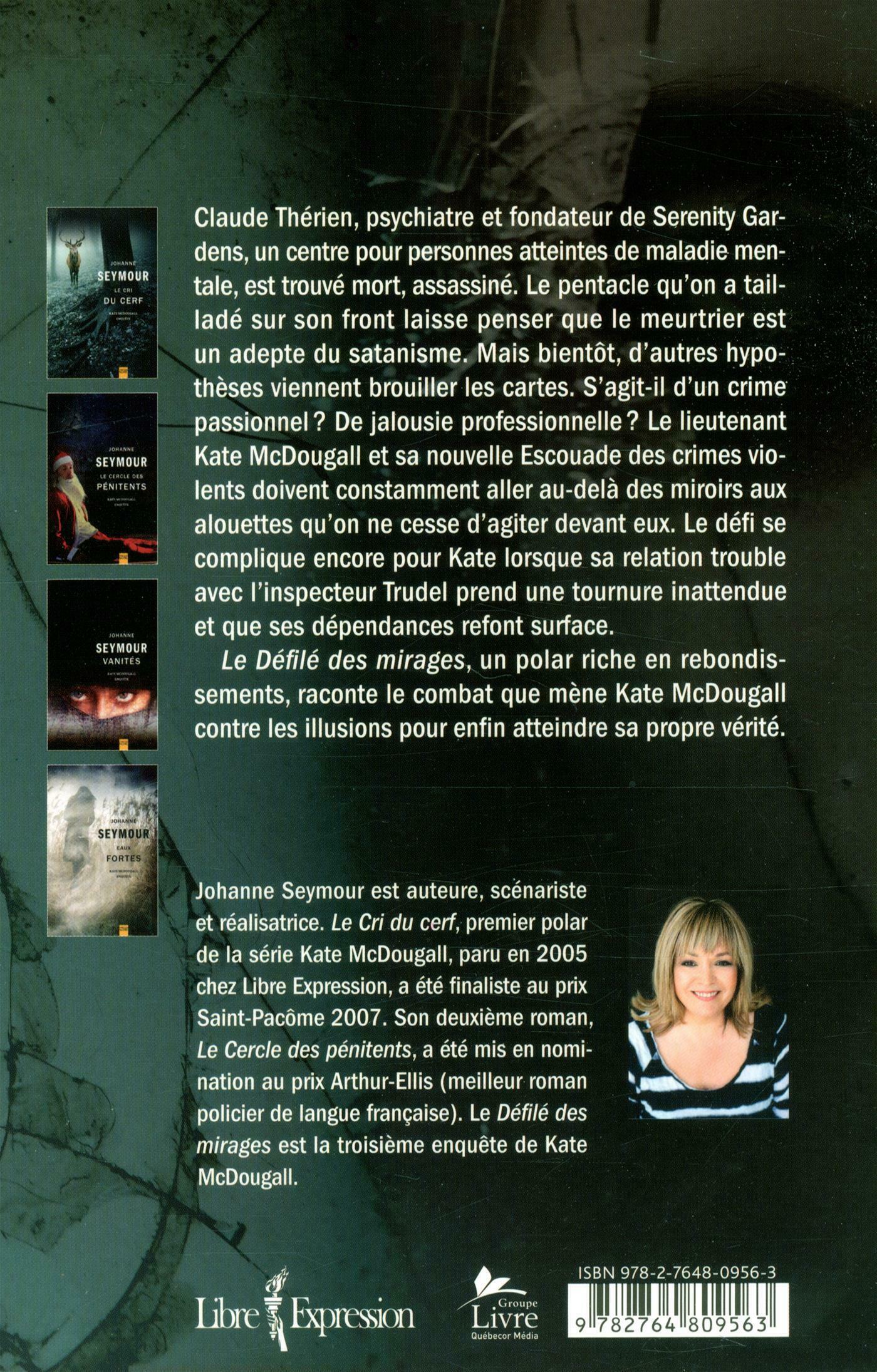 .Lorsqu'une autre victime, un pentacle gravé sur le front, est trouvée sur le site même du premier crime, Paul Trudel, le supérieur et ex-amant de Kate, décide d'inculper le vieil Arthur Thérien, malgré les objections renouvelées de Kate, qui n'arrive pas à prouver son innocence. Avec son dénouement tout à fait inattendu, Le Défilé des mirages est un suspense haletant dont les revirements illustrent les conflits intérieurs de Kate McDougall, ainsi que le sujet même de son enquête : la folie.