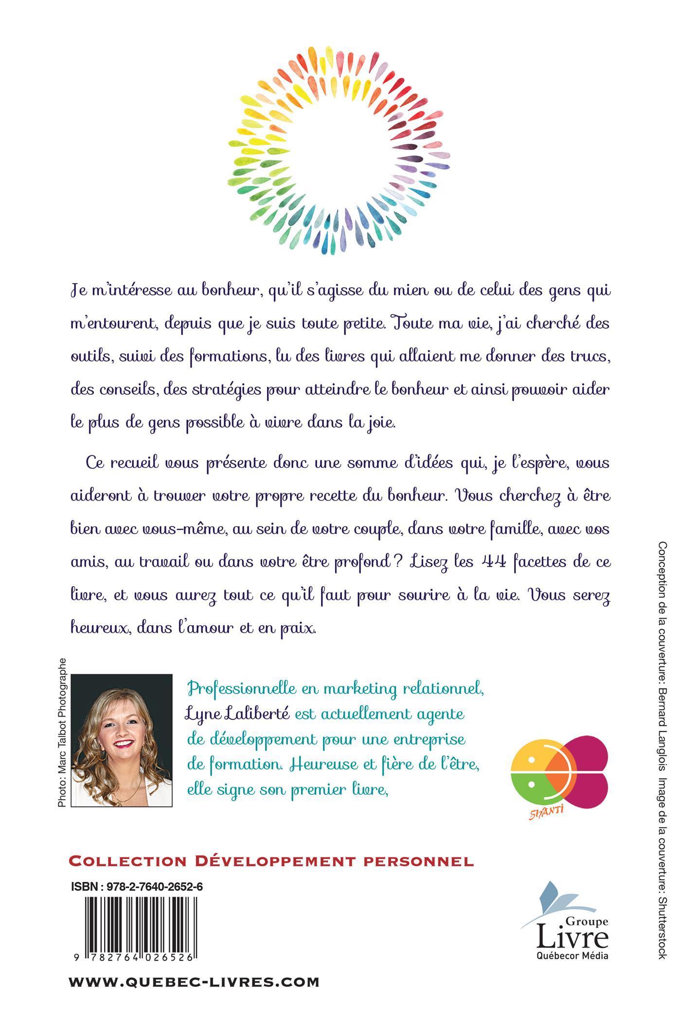 Ce recueil vous présente donc une somme d'idées qui, je l'espère, vous aideront à trouver votre propre recette du bonheur. Vous cherchez à être bien avec vous-même, au sein de votre couple, dans votre famille, avec vos amis, au travail ou dans votre être profond? Lisez les 44 facettes de ce livre, et vous aurez tout ce qu'il faut pour sourire à la vie. Vous serez heureux, dans l'amour et en paix.