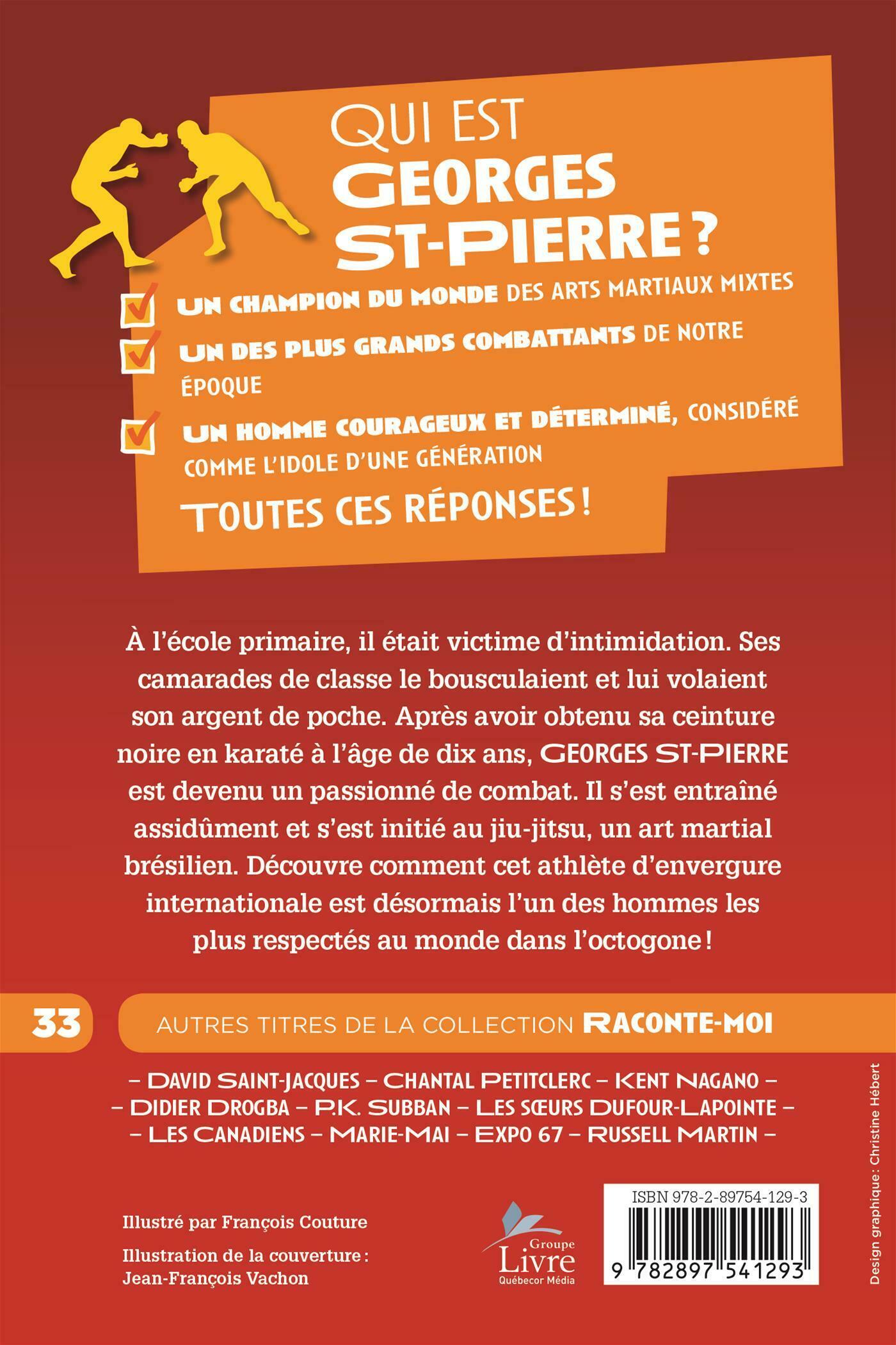 Qui est Georges St-Pierre? . . • Un champion du monde des arts martiaux mixtes .• Un des plus grands combattants de notre époque .• Un homme courageux et déterminé, considéré comme l'idole d'une génération . . Toutes ces réponses! . .À l'école primaire, il était victime d'intimidation. Ses camarades de classe le bousculaient et lui volaient son argent de poche. Après avoir obtenu sa ceinture noire en karaté à l'âge de dix ans, Georges St-Pierre est devenu un passionné de combat. Il s'est entraîné assidûment et s'est initié au jiu-jitsu, un art martial brésilien. Découvre comment cet athlète d'envergure internationale est désormais l'un des hommes les plus respectés au monde dans l'octogone!