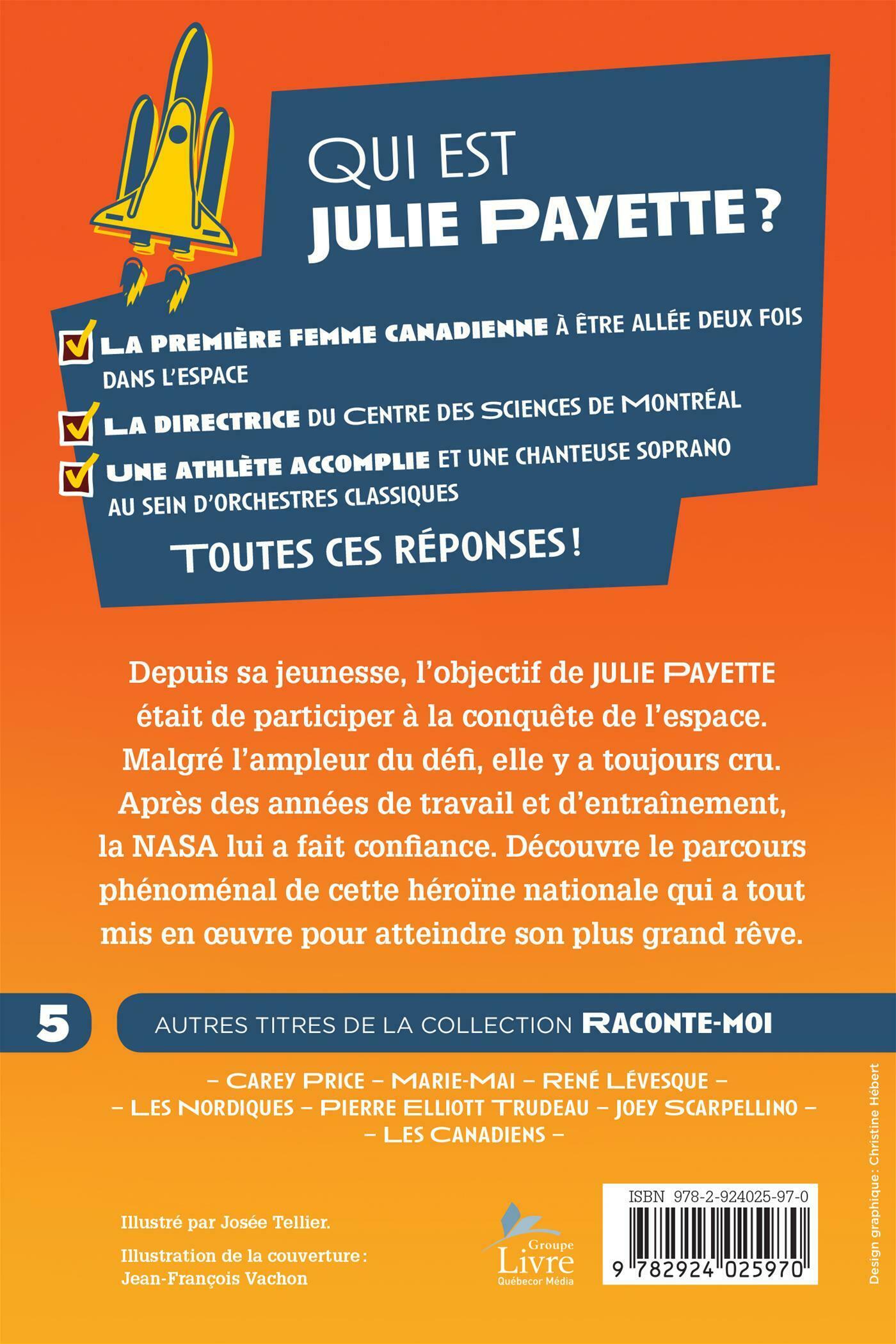 Qui est Julie Payette?? . .La première femme canadienne à être allée deux fois dans l'espace .La directrice du Centre des Sciences de Montréal .Une athlète accomplie et une chanteuse soprano au sein d'orchestres classiques . .Depuis sa jeunesse, l'objectif de Julie Payette était de participer à la conquête de l'espace. Malgré l'ampleur du défi, elle y a toujours cru. Après des années de travail et d'entraînement, la NASA lui a fait confiance. Découvre le parcours phénoménal de cette héroïne nationale qui a tout mis en œuvre pour atteindre son plus grand rêve.