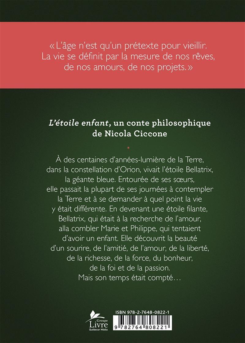 Inspiré par une de ses compositions – Faire la guerre à la mort, faire l'amour à la vie –, Nicola Ciccone écrit un conte philosophique, à la manière du Petit Prince. À des centaines d'années-lumière de la Terre, dans la constellation d'Orion, vivait une étoile qui se prénommait Bella, la géante bleue. Entourée de nombreuses autres étoiles, dont ses six soeurs, Bella passait la plupart de ses journées à contempler la Terre et à se demander à quel point la vie y était différente. Elle aimait être une étoile, mais les journées dans l'espace étaient interminables. Même si la forte luminosité de ses superbes flammes bleues et sa grande magnitude lui permettaient d'être vénérée par les autres étoiles, elle s'ennuyait. En devenant une étoile filante, Bella, qui était à la recherche de l'amour, alla combler Marie et Philippe, qui tentaient d'avoir un enfant depuis cinq ans. Dans une vingtaine de chapitres courts, Bella découvre la beauté d'un sourire, de l'amitié, de l'amour, de la liberté, de la richesse, de la force, du temps, du bonheur, de la foi et de la passion. Mais son temps est compté… Dans une imagerie juste et simple, Nicola Ciccone transmet son message d'amour et laisse ses personnages lui dicter ses mots.