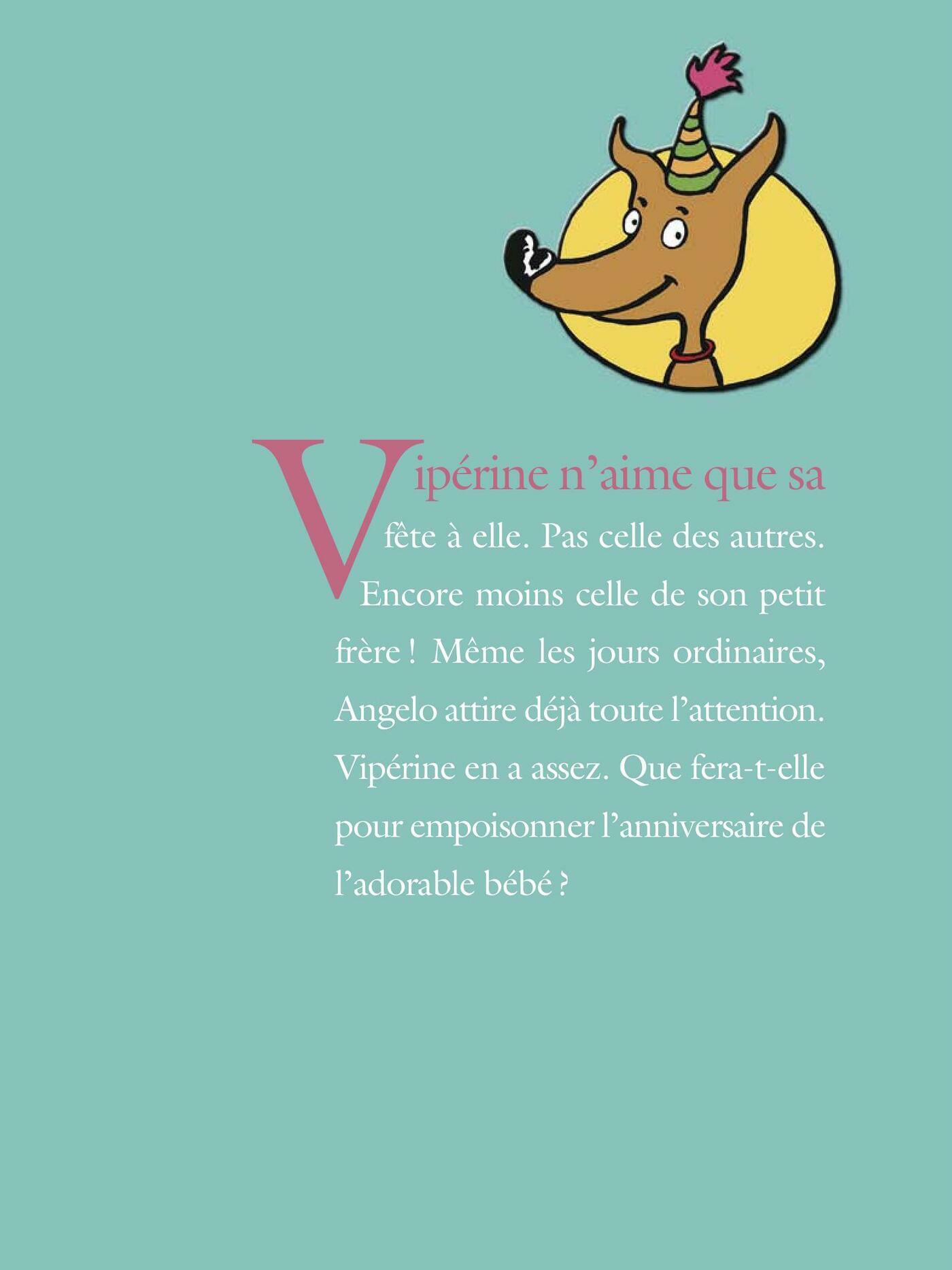 Vipérine est une petite fille en mal d'attention, coincée entre un grand frère redresseur de torts et un frérot angélique. Coléreuse, égocentrique, jalouse et joueuse de mauvais tours, ses tentatives maladroites pour se tailler une place dans la famille lui attirent plus d'ennuis que de profit. La journée s'annonce atroce : on fête les deux ans d'Angelo. Comme si Vipérine n'était pas déjà assez jalouse de l'adorable bébé ! Après s'en être prise aux ballons, notre petite peste trouve le moyen de saboter le gâteau d'anniversaire avec de l'huile de poisson. Elle croit avoir commis le crime parfait, mais a-t-elle sous-estimé les talents d'enquêteur de Justin, son frère aîné, le superjusticier ? Vipérine aura-telle sa revanche ?