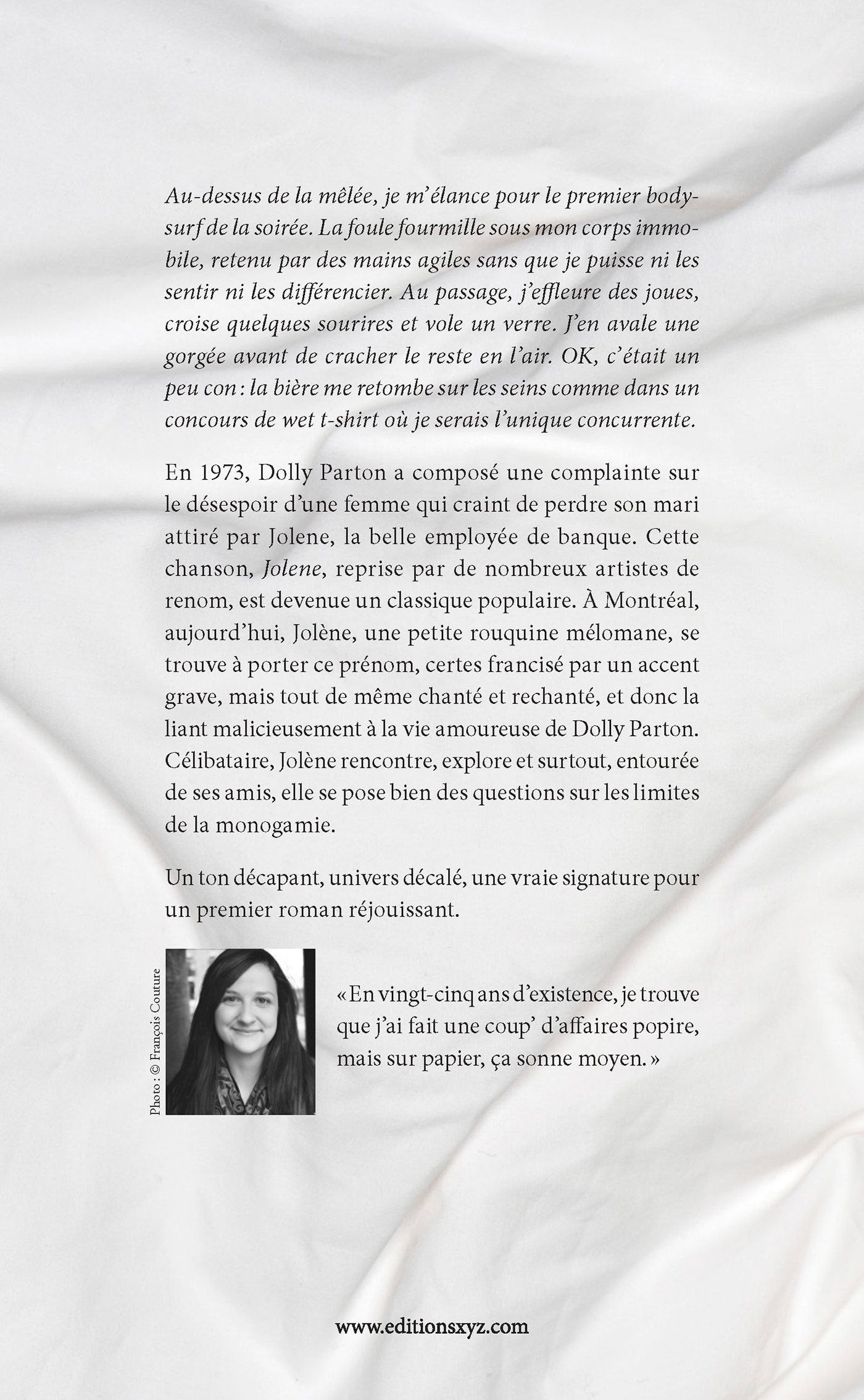Au-dessus de la mêlée, je m’élance pour le premier bodysurf de la soirée. La foule fourmille sous mon corps immobile, retenu par des mains agiles sans que je puisse ni les sentir ni les différencier. Au passage, j’effleure des joues, croise quelques sourires et vole un verre. J’en avale une gorgée avant de cracher le reste en l’air. OK, c’était un peu con : la bière me retombe sur les seins comme dans un concours de wet t-shirt où je serais l’unique concurrente. En 1973, Dolly Parton a composé une complainte sur le désespoir d’une femme qui craint de perdre son mari attiré par Jolene, la belle employée de banque. Cette chanson, Jolene, reprise par de nombreux artistes de renom, est devenue un classique populaire. À Montréal, aujourd’hui, Jolène, une petite rouquine mélomane, se trouve à porter ce prénom, certes francisé par un accent grave, mais tout de même chanté et rechanté, et donc la liant malicieusement à la vie amoureuse de Dolly Parton. Célibataire, Jolène rencontre, explore et surtout, entourée de ses amis, elle se pose bien des questions sur les limites de la monogamie. Un ton décapant, univers décalé, une vraie signature pour un premier roman réjouissant.
