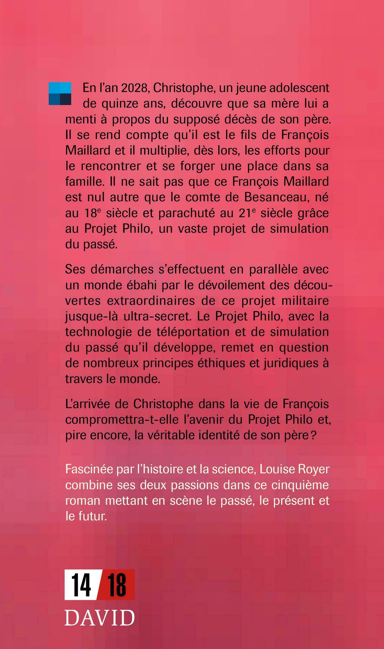 En l'an 2028, Christophe, un jeune adolescent de quinze ans, découvre que sa mère lui a menti à propos du supposé décès de son père. Il se rend compte qu’il est le fils de François Maillard et il multiplie, dès lors, les efforts pour le rencontrer et se forger une place dans sa famille. Il ne sait pas que ce François Maillard est nul autre que le comte de Besanceau, né au 18e siècle et parachuté au 21e siècle grâce au Projet Philo, un vaste projet de simulation du passé.Ses démarches s'effectuent en parallèle avec un monde ébahi par le dévoilement des découvertes extraordinaires de ce projet militaire jusque-là ultra-secret. Le Projet Philo, avec la technologie de téléportation et de simulation du passé qu’il développe, remet en question de nombreux principes éthiques et juridiques à travers le monde.L’arrivée de Christophe dans la vie de François compromettra-t-elle la confidentialité du Projet Philo et, pire encore, la véritable identité de son père ?Fascinée par l’histoire et la science, Louise Royer combine ses deux passions dans ce cinquième roman mettant en scène le passé, le présent et le futur.