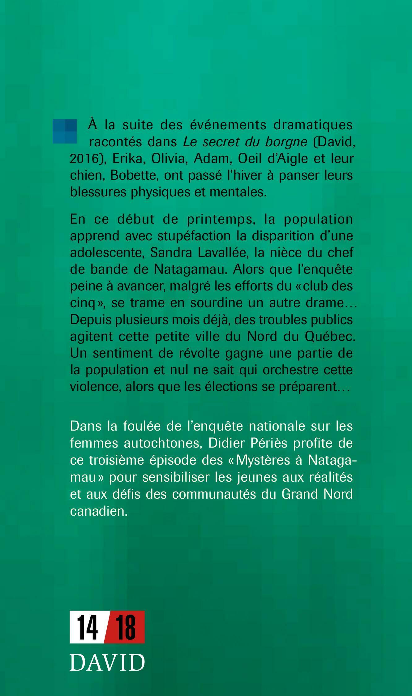 À la suite des événements dramatiques racontés dans Le secret du borgne (David, 2016), Erika, Olivia, Adam, Oeil d'Aigle et leur chien, Bobette, ont passé l'hiver à panser leurs blessures physiques et mentales.En ce début de printemps, la population apprend avec stupéfaction la disparition d'une adolescente, Sandra Lavallée, la nièce du chef de bande de Natagamau. Alors que l'enquête peine à avancer, malgré les efforts du «club des cinq», se trame en sourdine un autre drame… Depuis plusieurs mois déjà, des troubles publics agitent cette petite ville du Nord du Québec. Un sentiment de révolte gagne une partie de la population et nul ne sait qui orchestre cette violence, alors que les élections se préparent…Dans la foulée de l’enquête nationale sur les femmes autochtones, Didier Périès profite de ce troisième épisode des «Mystères à Natagamau» pour sensibiliser les jeunes aux réalités et aux défis des communautés du Grand Nord canadien.