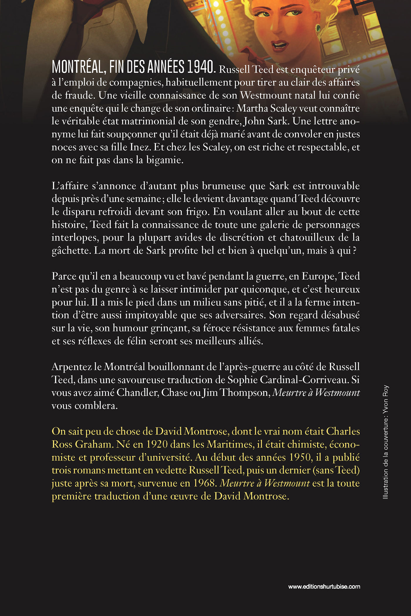 MONTRÉAL, FIN DES ANNÉES 1940. Russell Teed est enquêteur privé à l’emploi de compagnies, habituellement pour tirer au clair des affaires de fraude. Une vieille connaissance de son Westmount natal lui confie une enquête qui le change de son ordinaire: Martha Scaley veut connaître le véritable état matrimonial de son gendre, John Sark. Une lettre anonyme lui fait soupçonner qu’il était déjà marié avant de convoler en justes noces avec sa fille Inez. Et chez les Scaley, on est riche et respectable, et on ne fait pas dans la bigamie.L’affaire s’annonce d’autant plus brumeuse que Sark est introuvable depuis près d’une semaine; elle le devient davantage quand Teed découvre le disparu refroidi devant son frigo. En voulant aller au bout de cette histoire, Teed fait la connaissance de toute une galerie de personnages interlopes, pour la plupart avides de discrétion et chatouilleux de la gâchette. La mort de Sark profite bel et bien à quelqu’un, mais à qui? Parce qu’il en a beaucoup vu et bavé pendant la guerre, en Europe, Teed n’est pas du genre à se laisser intimider par quiconque, et c’est heureux pour lui. Il a mis le pied dans un milieu sans pitié, et il a la ferme intention d’être aussi impitoyable que ses adversaires. Son regard désabusé sur la vie, son humour grinçant, sa féroce résistance aux femmes fatales et ses réflexes de félin seront ses meilleurs alliés.Arpentez le Montréal bouillonnant de l’après-guerre au côté de Russell Teed, dans une savoureuse traduction de Sophie Cardinal-Corriveau. Si vous avez aimé Chandler, Chase ou Jim Thompson, Meurtre à Westmount vous comblera.